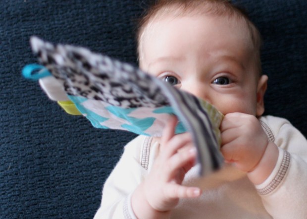 my son is now 4 months old, and sort of teething.  he can use his hands well enough to grab and hold onto things, and EVERYTHING goes straight into his mouth.  i was at the fabric store with him this weekend, and he started getting a little fussy as i was checking out (too much time at bolt, one of the best places in the world??  blasphemy!).  anyway, i gave him a freshly purchased fat quarter for him to shove in his face and buy me time to get back to the car, his ultimate relaxation machine.  that gave me a better idea…to take a quilt break and sew him a quick little teether!  so i whipped this up last night: