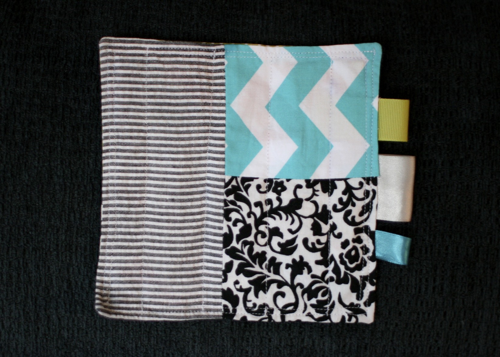 i picked high-contrast fabrics because babies like that kind of thing, and added a few ribbon loops for extra textural fun.  i stuffed it with an empty travel wipes wrapper for a nice crinkly sound, then quilted it to keep the plastic from bunching.  i figure i can still wash it, but probably not dry it.