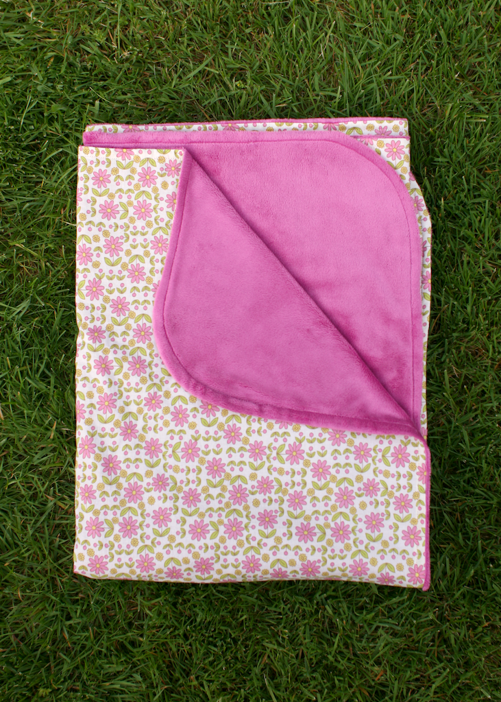 my friend rizeld has two adorable boys, with her third little one on the way…a girl!  she is due in late july.  i wanted to make the blanket super soft, but also a little lighter weight than flannel/minky (which is what i normally do) because she’s having a summertime baby.  i found this really soft cotton lawn (timeless treasures “darling clementine”), paired it with a darker pink minky cuddle, and there you go!  super snuggly and plenty girly.  i just get 1 yard of each fabric, so it ends up a good stroller/naptime blanket size.