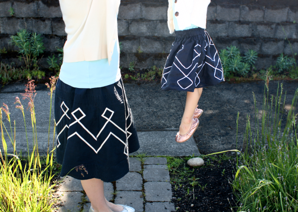 so in a sudden burst of inspiration, i made her a skirt inspired by one that i often wear (mine is store-bought from ann taylor loft a while ago).  when i first showed it to her, she giggled.  as i dressed us in the same outfits this morning (down to our metallic ballet flats), she said “hey mommy, we match-match!  we got the same skirt on!” with the biggest smile on her face and more giggles.  someday, this may embarrass her.  but today, to my little 3-year-old, it was a dream come true to look just like mommy.