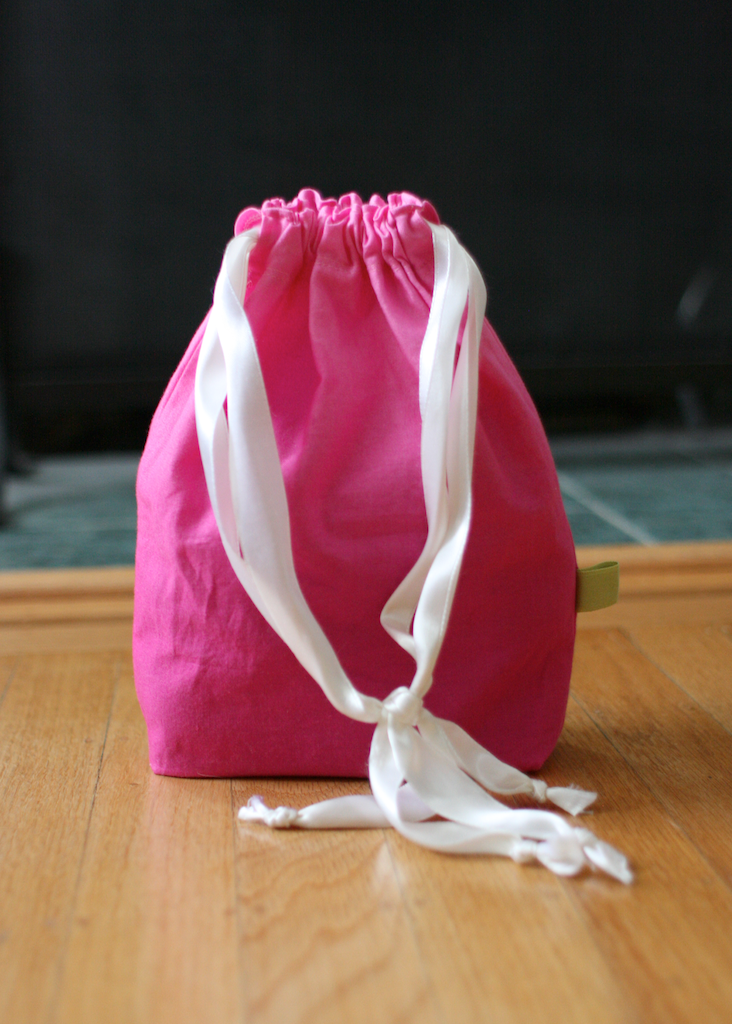 the shoe bag has a boxed bottom, so it stands up on its own and is the perfect size for both pairs of shoes. the fabric is kinkame shades gradient cotton from fabric depot, with satin ribbon ties (like toe shoes!). i added a little green ribbon tag to make it look “professional.” 🙂