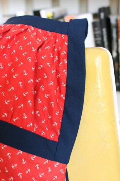 we went to fabric depot together, and she picked out her fabric.  i had expected her to gravitate towards the vintage reproduction prints (30s era, maybe?) but she went for anchors and polka dots, in a full-blown red, white, and blue color scheme (more ’50s nautical rockabilly).  this girl is a style chameleon!  the anchors are bar harbor by polly minick & lauri simpson for moda.