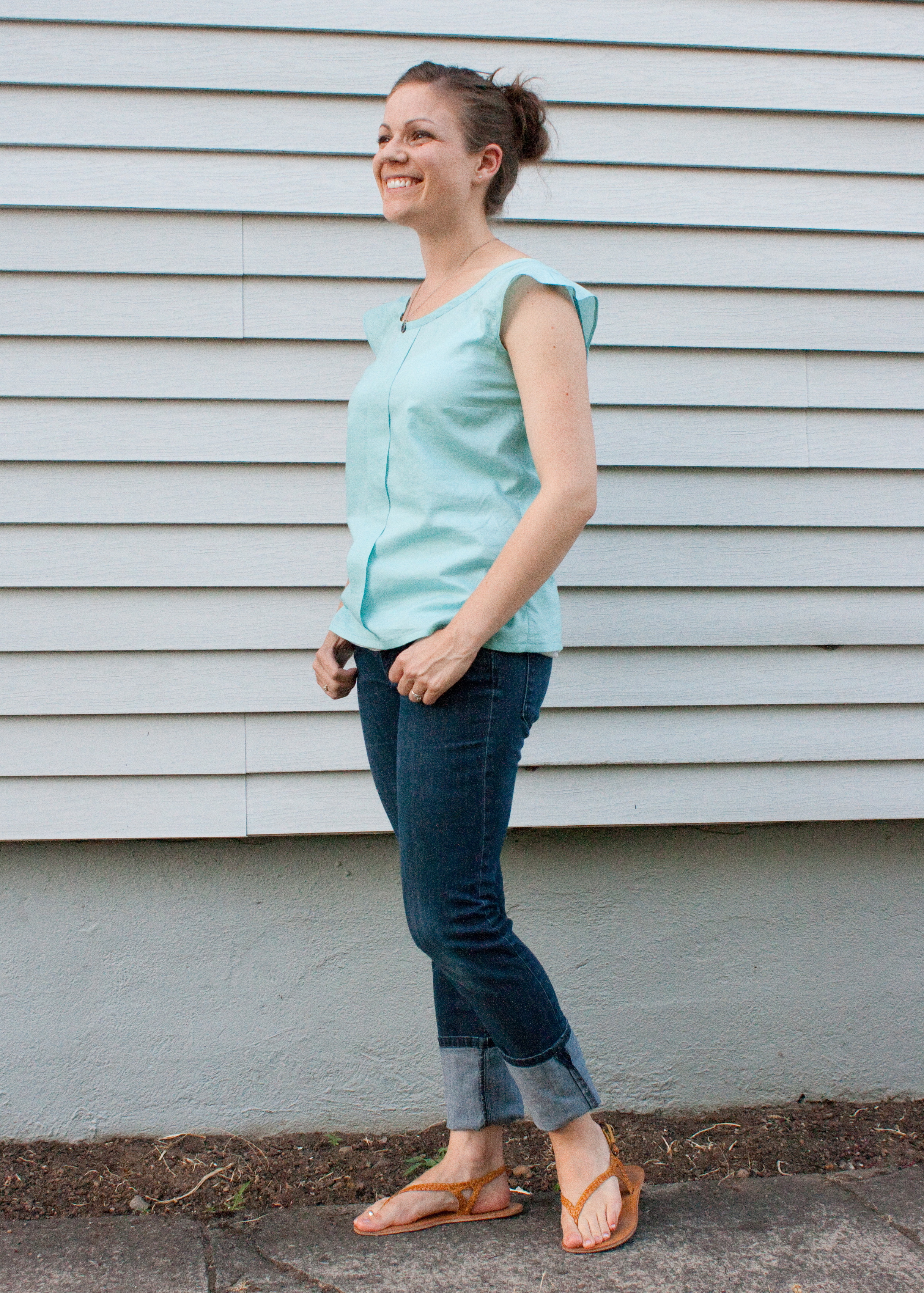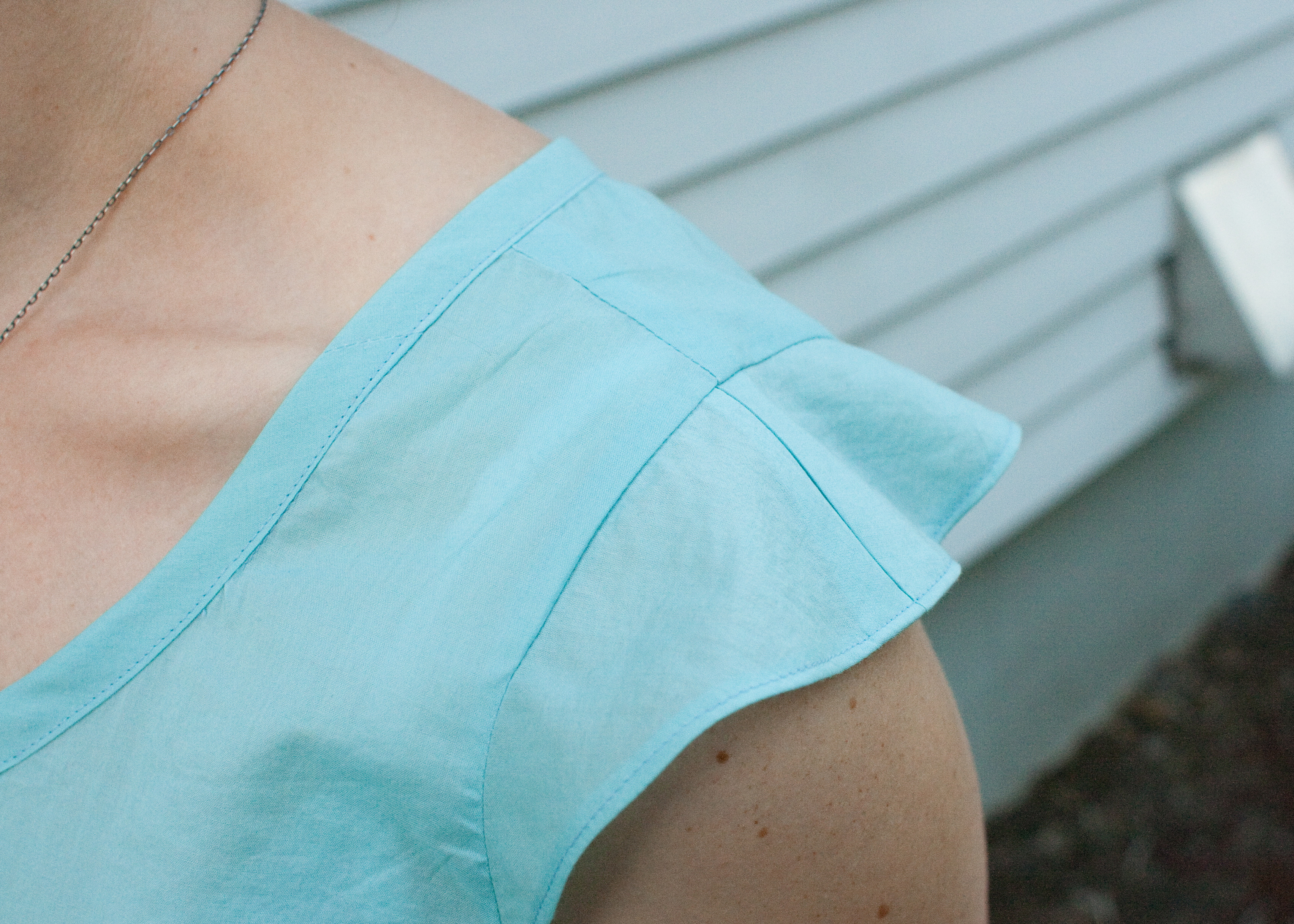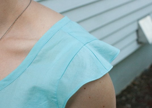 the fabric is a free spirit voile that i’ve had in my stash for a while. i love the fabric and was nervous cutting it because i expected to have a complete failure on my hands, but i’m so glad i used it! i love wearing blue. and check this out! i wore it to work already! it was under a jacket, but no one said a word about it all day. i think that’s a good sign? 🙂