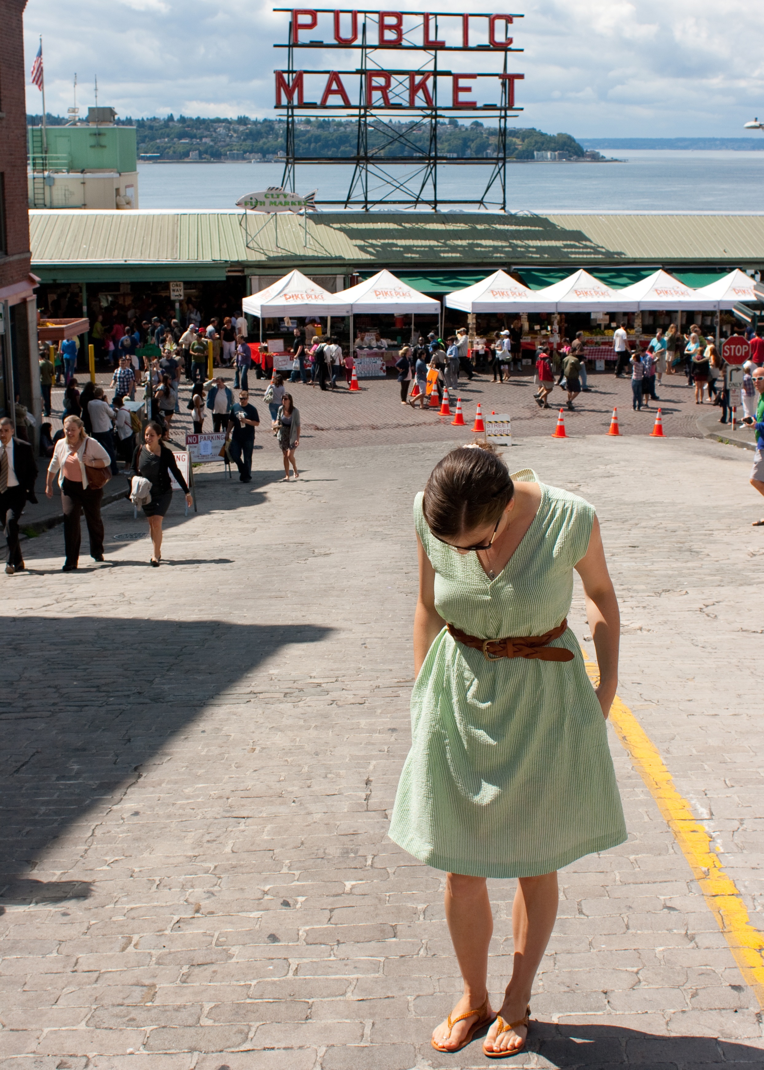 my husband’s college roommate got married in a beautiful evening ceremony in seattle last weekend, so we headed up for a 27 hour getaway, sans kids. i was pretty nervous about leaving O (especially while still nursing), but he and Em did great with grammie and grandpa and we got to sleep in until 9am for the first time since he was born! anyway, back to the dress, my very first dress i’ve sewn for myself. the photo above is pre-lunch, wandering around the pike place market area figuring out what to eat.