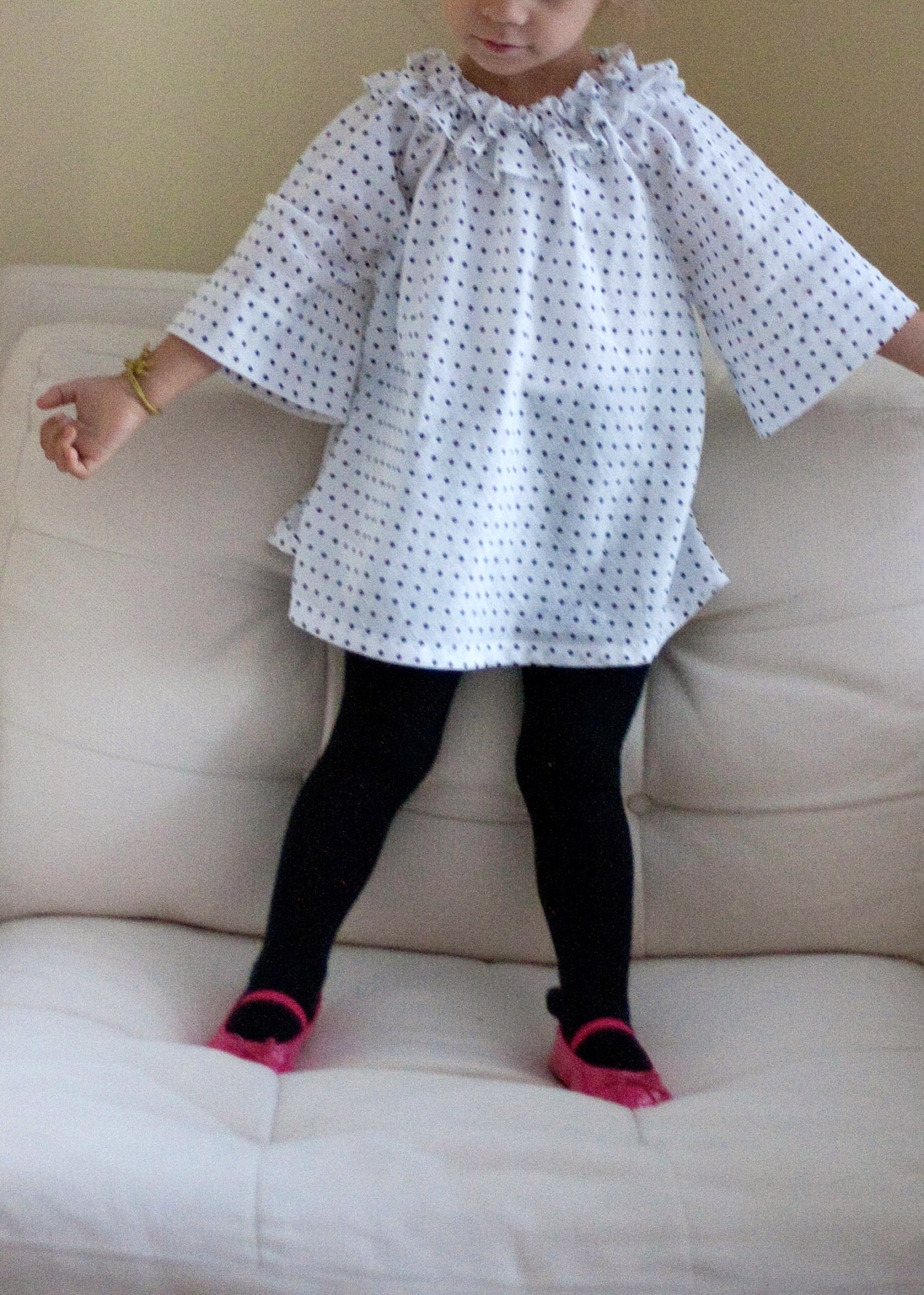 i printed and cut out the tester pattern over my lunch break at work, and sewed it that night.  i cut it on the bias because all the versions that rae had made were cut that way, and it adds to the swinginess.  it’s a very roomy garment and everything is cut on the fold.  this meant, for a 3T, even 1 2/3 yards of fabric wasn’t quite enough!  i’ve historically bought just 1 yard of fabric for kids’ clothes, but now that Em is getting bigger, that doesn’t seem to cut it anymore.