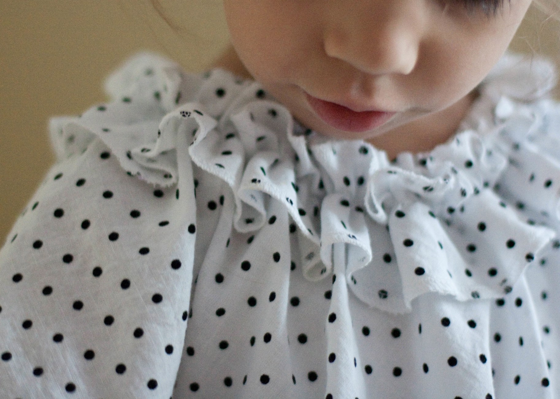 luckily, i had this cute swiss dot from joann in my stash (i think i got it as an end-of-bolt, hence the weird 2/3 yard – either that or i got 2 yards and it shrunk like crazy).  part of rae’s pattern testing request was to help her determine yardage for the various sizes, and mine still wasn’t enough (i had to piece the ruffle).  can’t tell, though!