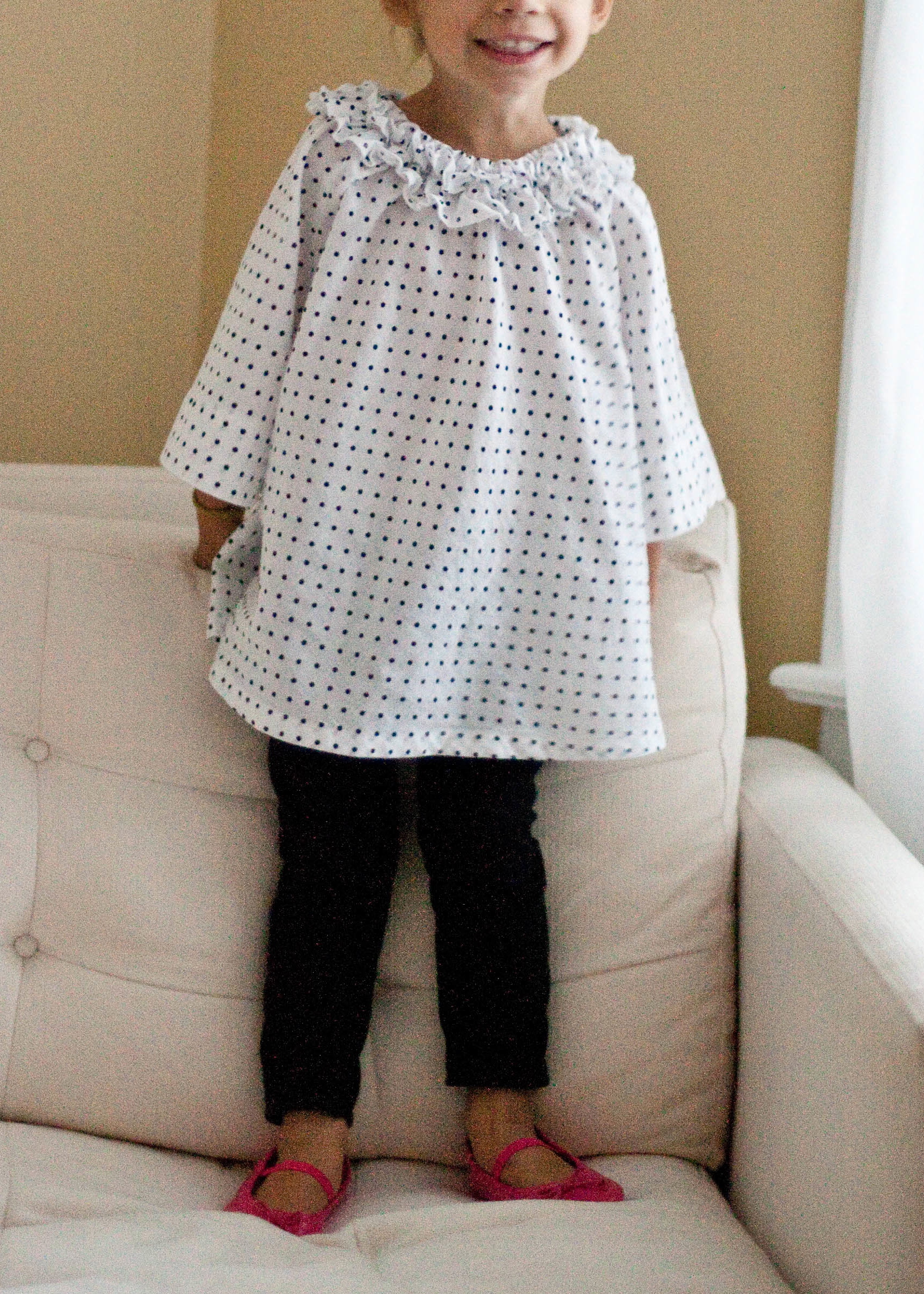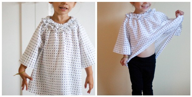 way back in march, rae of the fantastic made by rae put out a call for people to test her various in-the-works patterns.  i immediately signed up to be a pattern tester for the pierrot tunic and crossed my fingers hoping she’d pick me.  she first posted it on her baby daughter over a year and a half ago here, and has posted a few versions since.  each time i saw a new pierrot post pop up, i just melted (pink and chambray, for instance).  i don’t know what it is, but i just die over it.  something about the exaggerated shape, neck ruffle, and wide cuffs just makes me smile.  it seems like a something you’d pay a ridiculous amount of money for at a high-end boutique.  i could not wait to make one for Em.