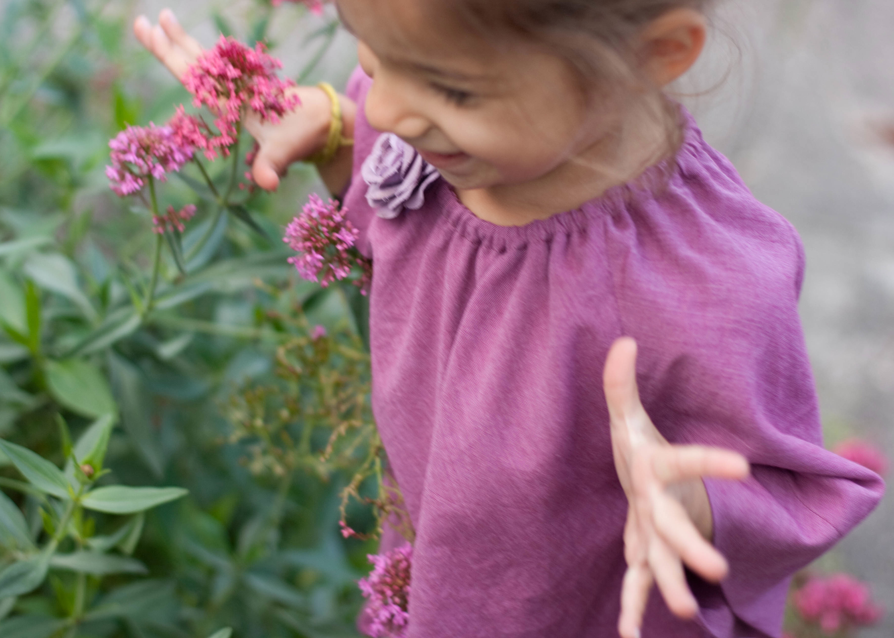 Em has worn her polka dot pierrot top just about as many times as she possibly could in the week and a half since i made it (between trips through the wash). it has turned out to be a fantastic little compromise item for a dress-loving girlie and her weather-conscious mama, because it’s pretty much the only thing she’ll wear pants with. so i made her another one.