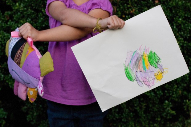 last night, i was able to sew up a little project that i had cut and ready prior to KCWC, but in the hustle and bustle i hadn’t gotten to it yet.  it’s an idea that i saw on hart + sew, a lovely blog i just started following recently after we both guest posted for sparkle power!.  stacy had her daughter draw a monster, then she helped turn it into a stuffie!  i thought it was the sweetest idea and something Em would definitely get behind.  i asked her to draw an animal/monster, let her pick fabrics out of my scrap pile, and i sewed it up.  here’s what we came up with:
