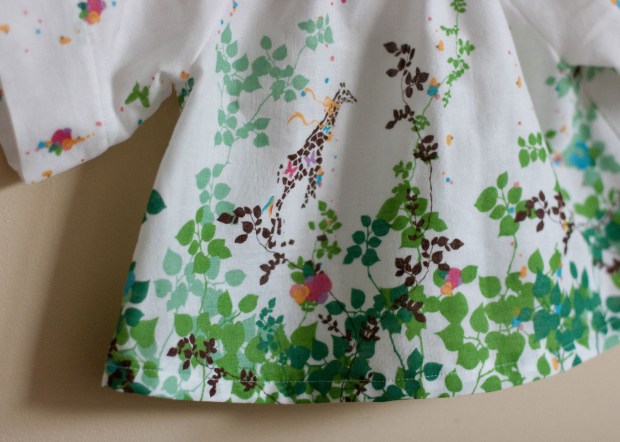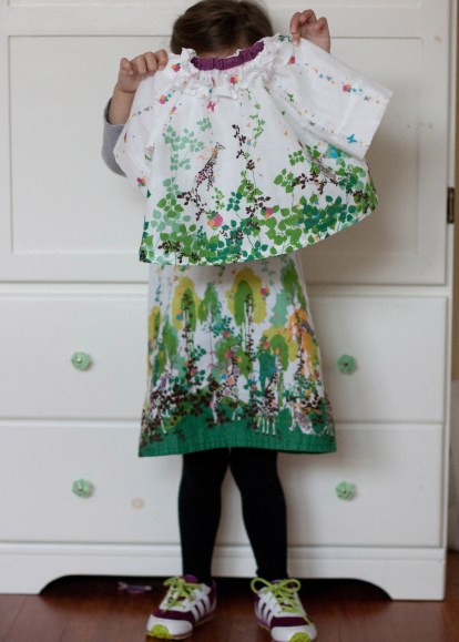 the pattern is made by rae’s pierrot tunic (which fits more as a dress for the little sizes), 0-3 month size.  the fabric is hide and seek by kayo horaguchi (with kona cotton neckline facing).  i wanted Em to show how tiny this dress was in comparison to her wearing one of her two 3T pierrot tops, but instead she insisted on wearing her “zebra dress.”  she wanted the dress with the matching fabric!