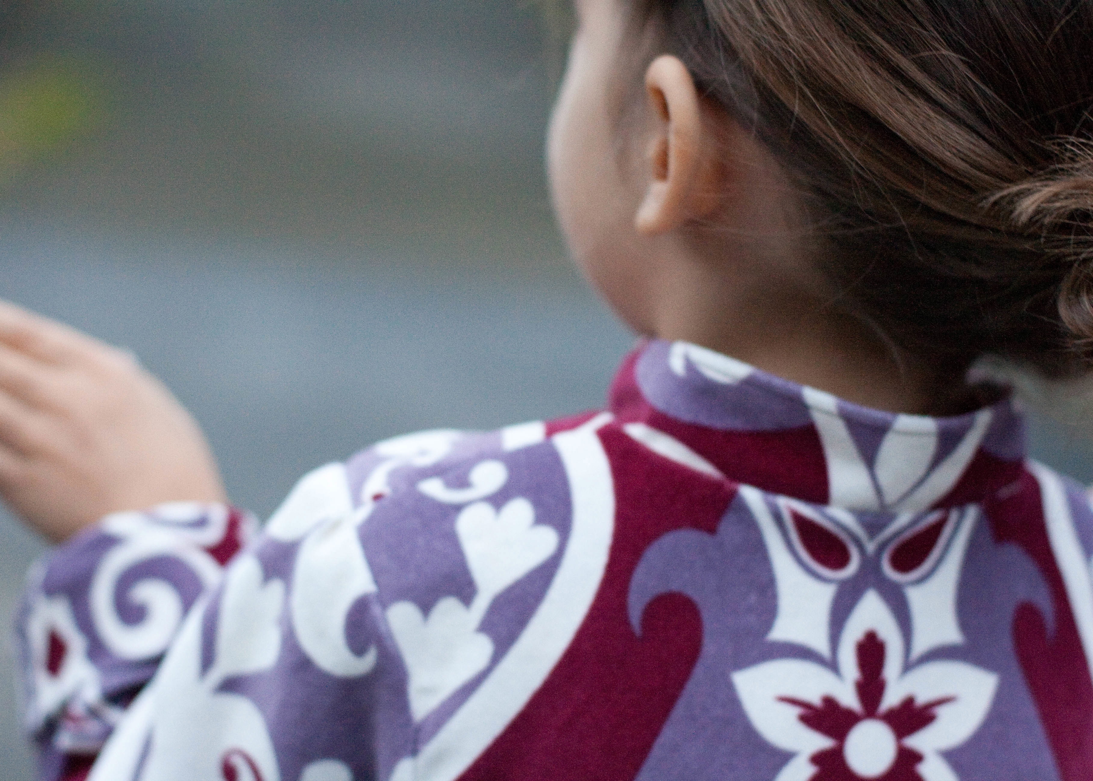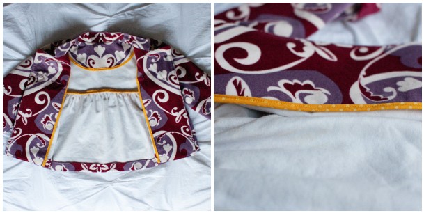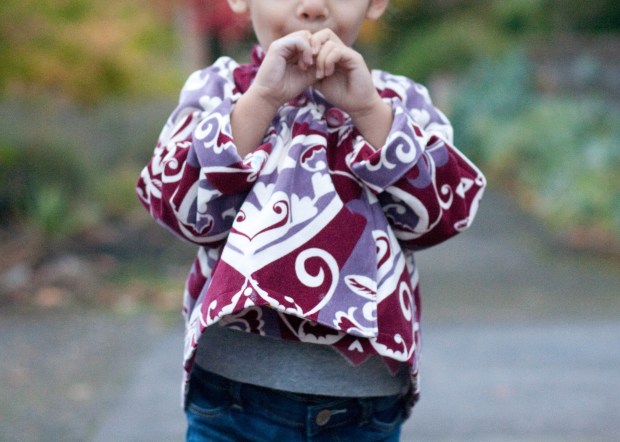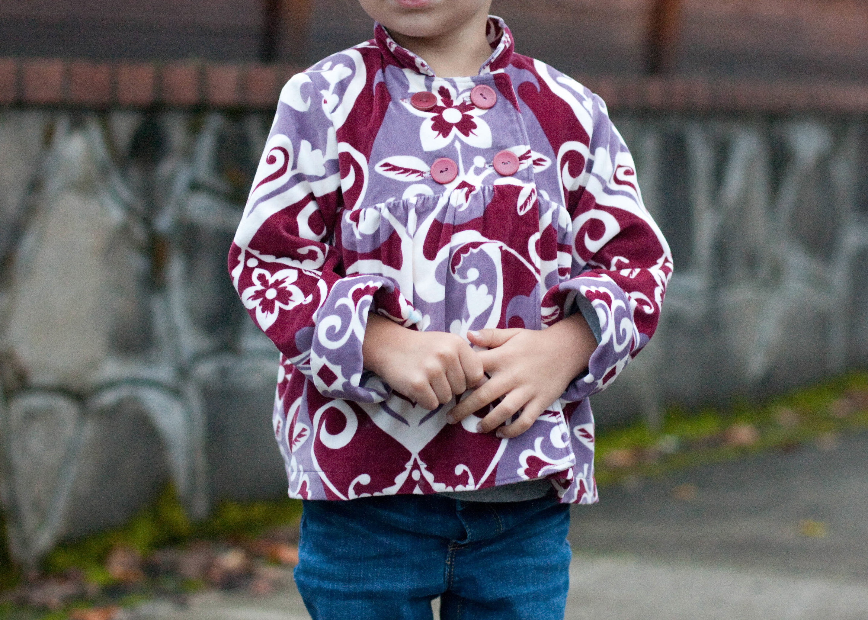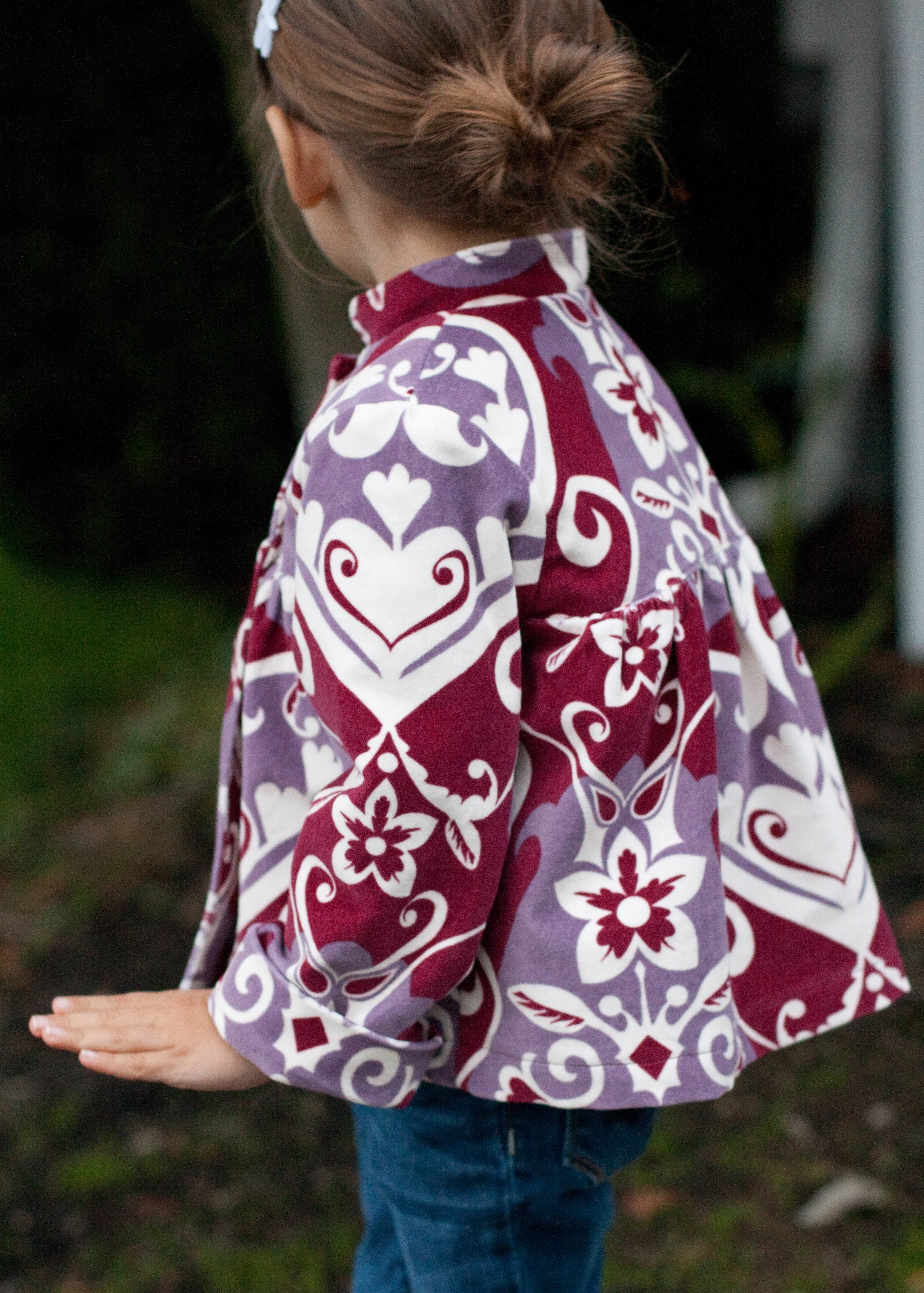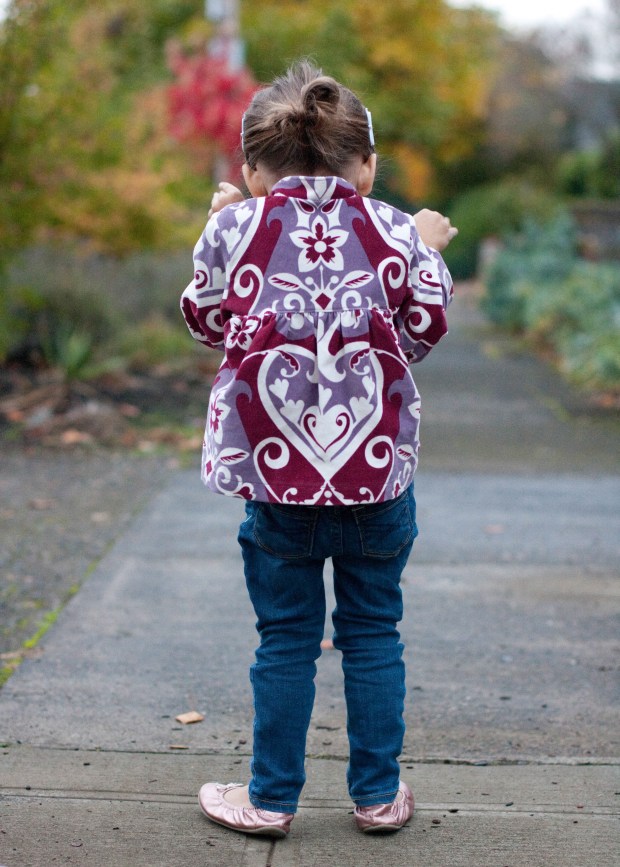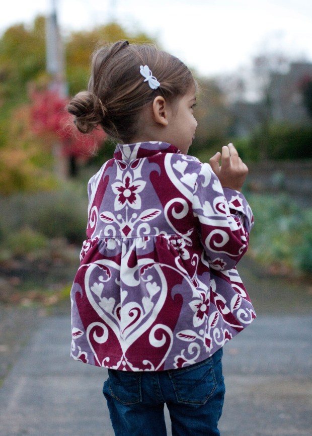 she is such a little doll, and her fabric selection is perfectly lovely! i love how you centered the print and the pop of color inside. it’s a beautiful little fall jacket!