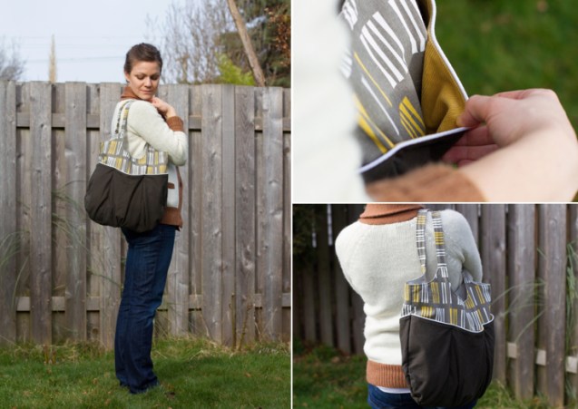 for a while i had known this would be my first post-PR&P project.  i started a new job a few months ago, and the best way to get to work now is via public transportation (either bus or light rail).  i needed a new purse that was large enough to hold everything i need for the day (coffee, breakfast and sometimes lunch too, a sweater, maybe even a second pair of shoes), but compact enough to stay close to my body on crowded bus days where i end up standing 2″ away from the person next to me, or sitting next to a big dude.  my margaret bag, while plenty large, sort of sticks out behind me and once caused a lady to accuse me of “bashing her” with my purse (totally unbeknownst to me!).  this bag will not bash anyone, and it is perfect.