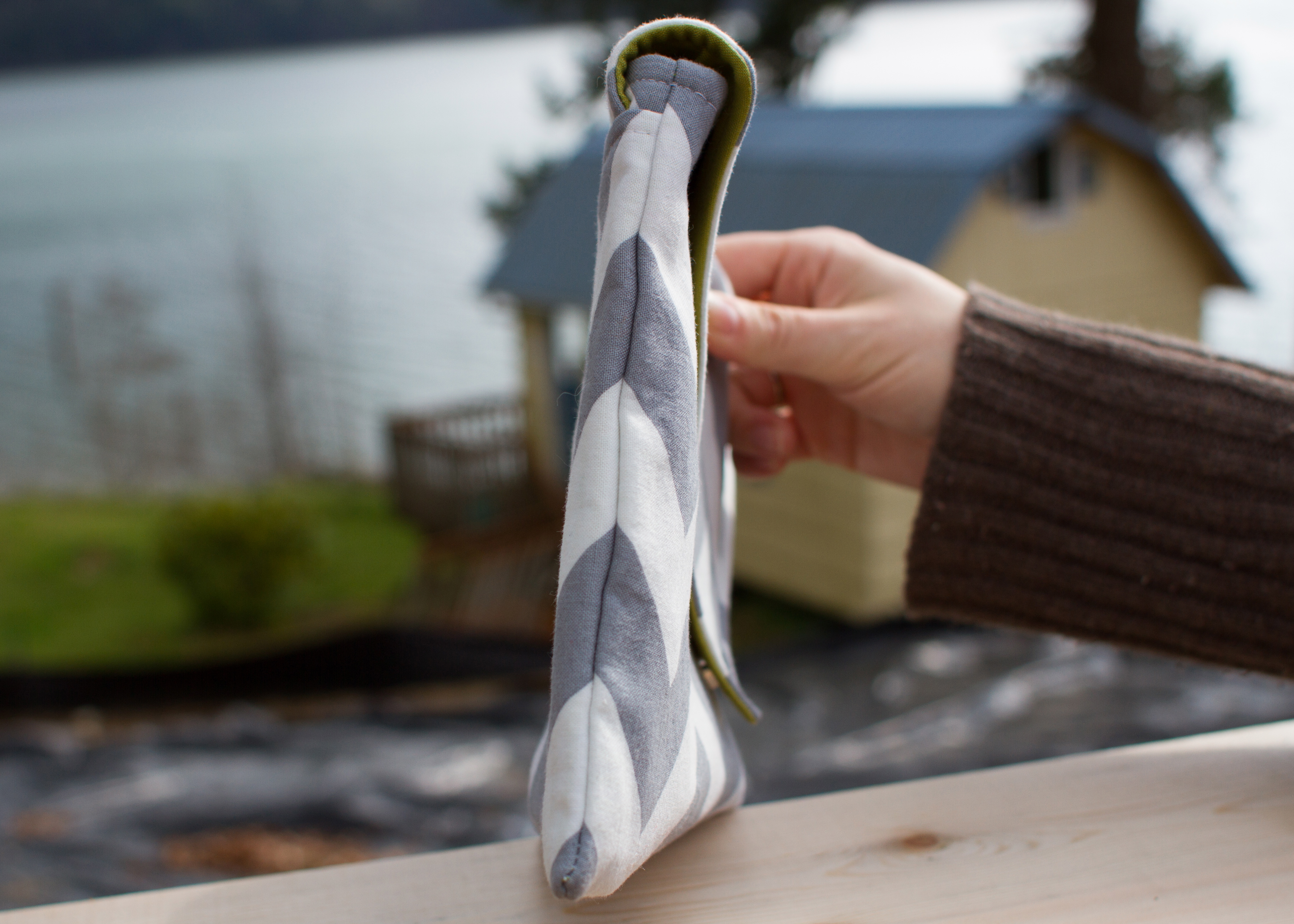 i made the large version with pointed flap. the outer fabric is a gray chevron (half moon modern by moda), and i flipped it upside down on the flap for an interesting geometric contrast. on the inside, i used my favorite solid, kona olive.
