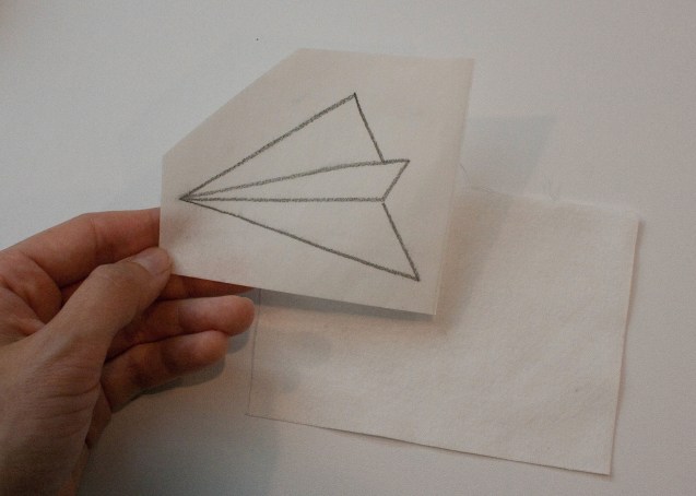 Trace your appliqué onto the fusible web paper.  Cut out the general shape.  Remove the backing paper, stick it to the wrong side of your scrap, then cut out your shape (I have a pair of sewing scissors dedicated to this purpose).  Don’t cut the inner lines of the paper plane.  They’re provided to guide your stitching later.