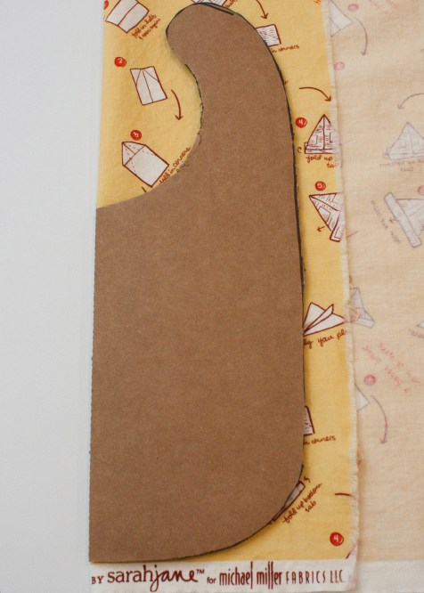 Cut out bib template, trace shape onto main fabric on the fold (I traced mine onto cardboard since I use it so often).  Cut out the bib front.