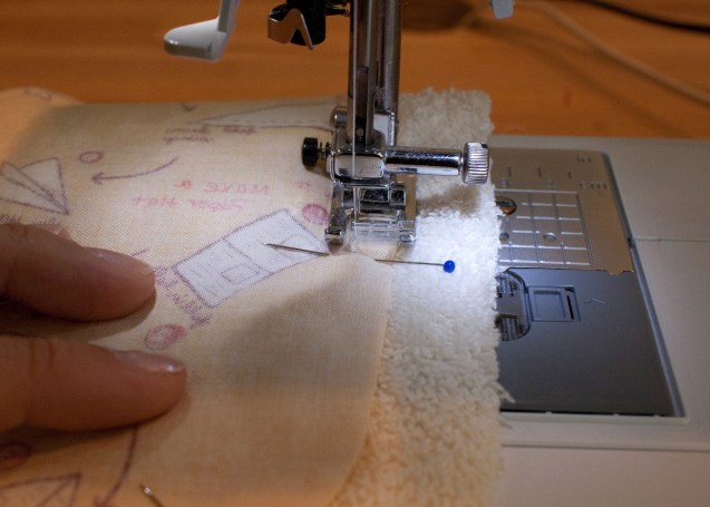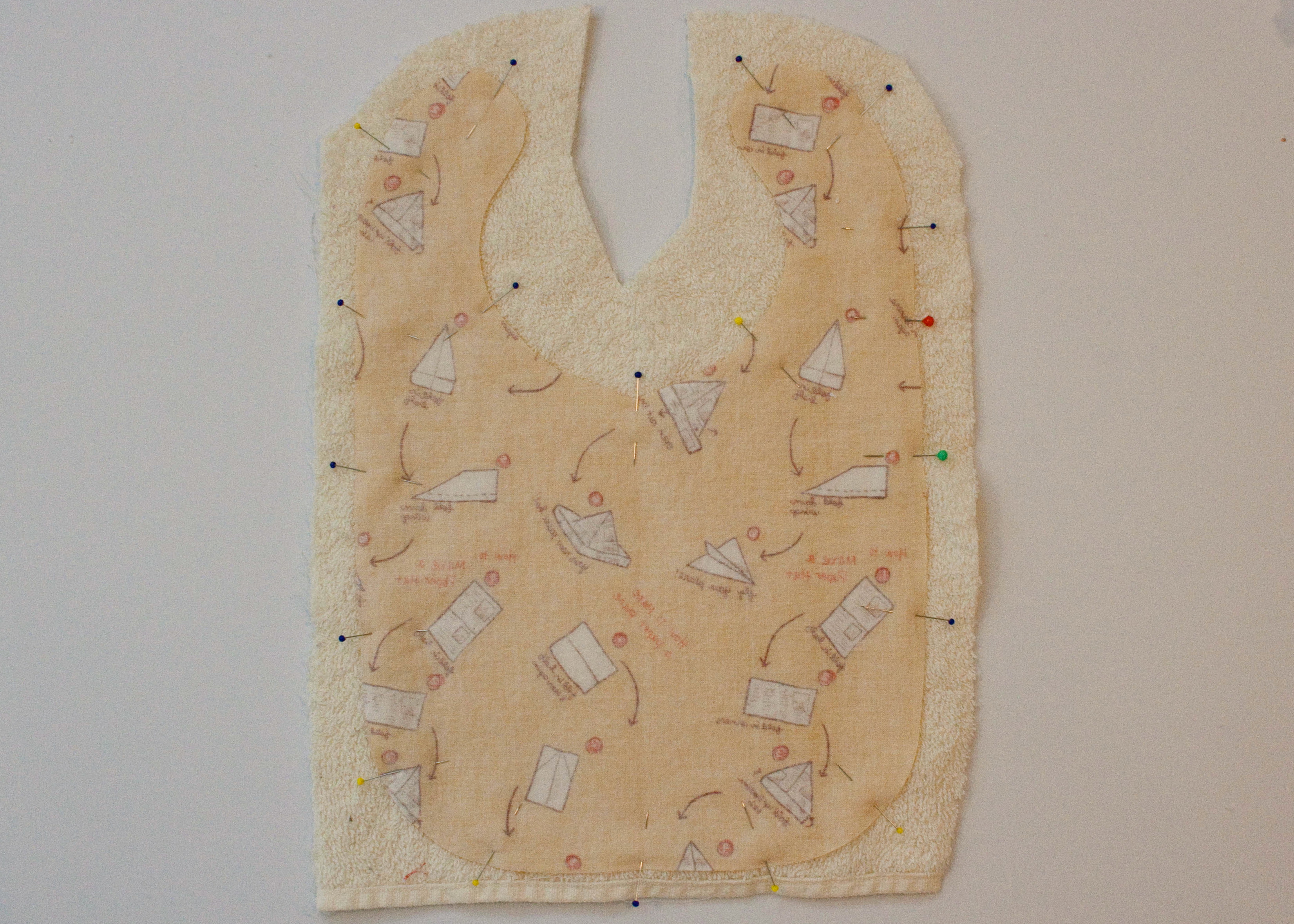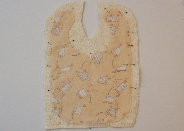 Place bib front right sides together with backing fabric, pin, cut out the backing in the general shape of the front bib.  This allows for a little margin of error while sewing, since terry cloth tends to shift a little bit.  It’s also quicker because you don’t need to be as accurate while cutting out the backing.  Pin around the edges, marking a 2″ opening to turn.