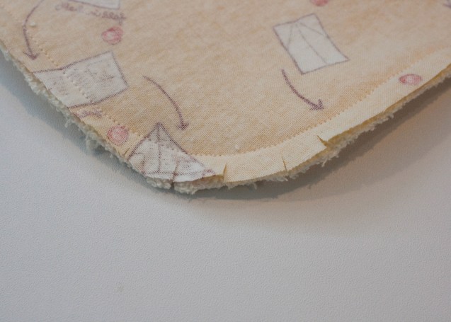 Turn rightside out, using your point turner to poke out the neck tabs completely.  Finger press, then press with an iron on the front side of the bib (terry-cloth and minky don’t iron well).