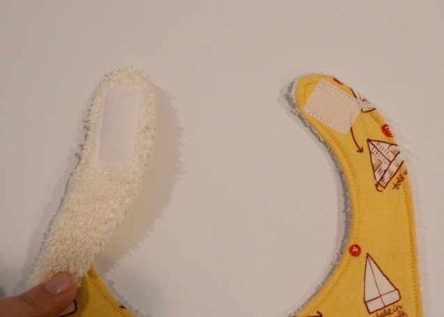 Sew on velcro.  Sew 1.5″ of the fuzzy side on to the backing side of the left neck tab, and 1″ of the scratchy side onto the front side of the right neck tab (or add snaps, if your little one is prone to compulsively ripping off their bib).