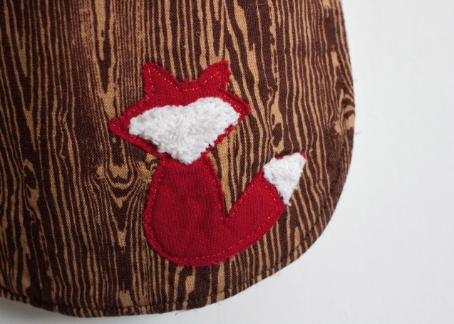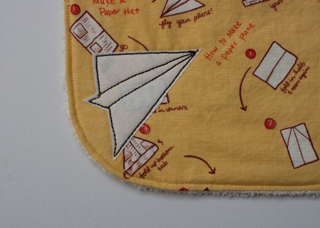 Add details to the appliqué.  For the whale’s eye, I use fabric marker, but it could also be embroidered.  Appliqué small scraps of the terry for the fox’s face and tip of the tail.  Mark the paper plane’s “folds” with disappearing fabric pen and use contrasting thread in your machine to stitch the detail.