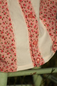 I actually love how the dress came out with the pieced white panels on each side of the center. Rather than a zipper, I closed the dress with these great pink, vintage buttons all the way down the back. And then I couldn’t resist throwing some embroidery on there, too.