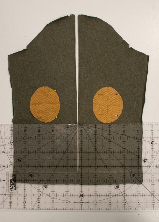 Place bib front right sides together with backing fabric, pin, cut out the backing in the general shape of the front bib. This allows for a little margin of error while sewing, since terry cloth tends to shift a little bit. It’s also quicker because you don’t need to be as accurate while cutting out the backing. Pin around the edges, marking a 2″ opening to turn.
