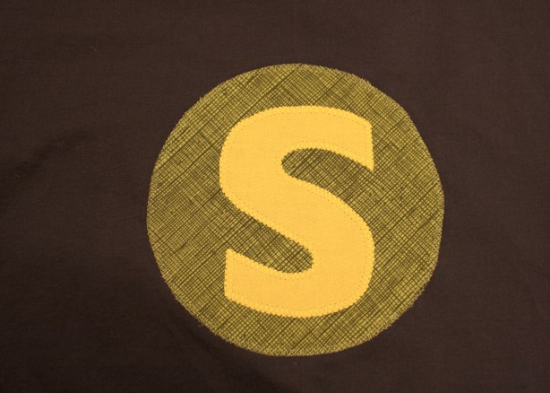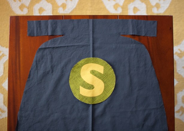 make your applique. i like to use gill sans bold font in about 500 pt for the recipient’s initial, but it could be fun to do a lightning bolt or an existing superhero logo too. cut a circle that your logo/letter will fit inside. don’t forget to trace your letter backwards! i trace my letter onto steam-a-seam paper first, peel off one side, stick to the fabric, then cut it out together using an older pair of sewing scissors.