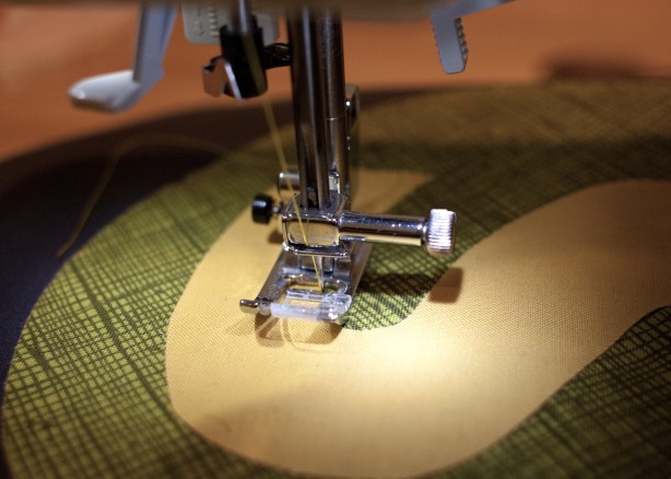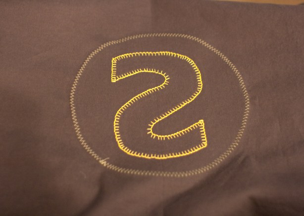 sew the letter/logo applique onto the cape. i like to use a blanket type stitch like number 11 on my machine. i change the length to 3.0 an the width to 4.0, but you can play around with it on a scrap to see what look you prefer. then sew around the edge of the circle with a wider, longer zigzag.