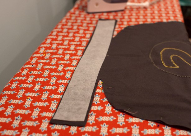 fuse a strip of interfacing that’s about .5″ smaller than the length and width of the neckband to the wrong side of the main fabric (so about 1.5″ x 18.5″). interfacing helps the neckband stands up a bit like you see on a real superhero. π