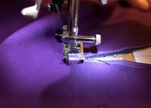 sew around the perimeter with a 1/2″ seam allowance, pivoting and sewing down a few stitches at the point where the neckband meets the shoulder area, then pivoting again to continue down the side of the cape.
