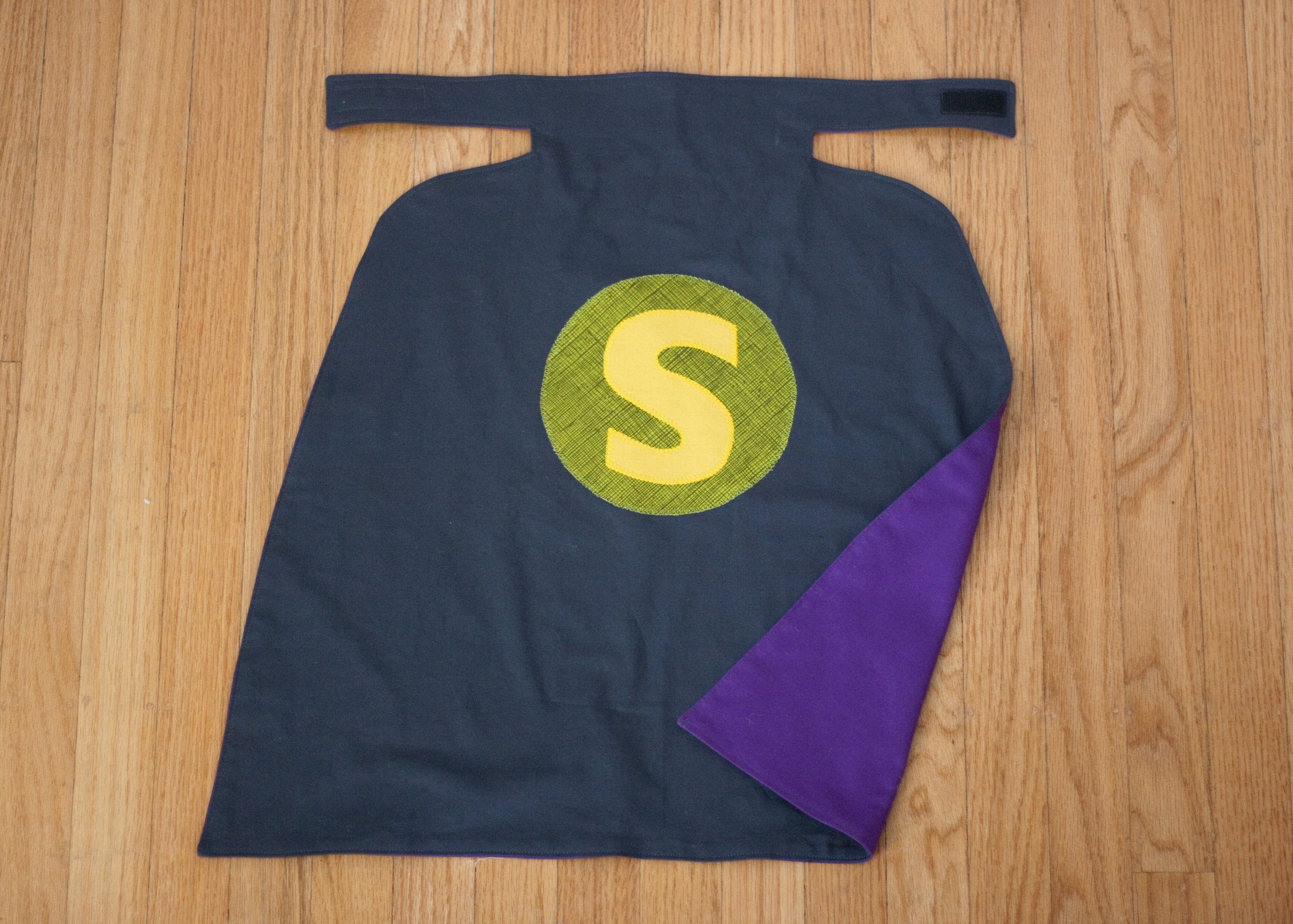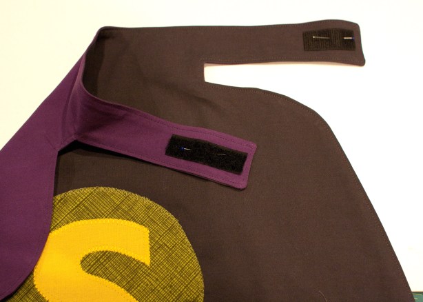 this cape is actually a christmas present for my nephew S, the youngest of three boys. he’s 3.5 and loves to dance crazy hip hop moves to justin bieber music, so he gets purple lining in his cape. i’ve already made capes for his two older brothers (here and here), and he also has cape envy of Em’s. it was about time i made him one too!