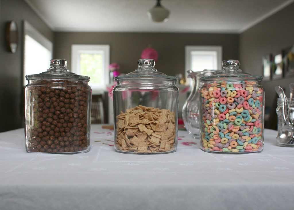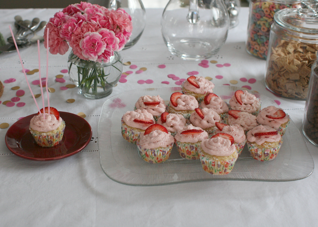 we had a 9am breakfast party, since two of em’s cousins had a t-ball game later. breakfast parties are great! parents of young children (and grandparents) are up early anyway, and generally in a good mood as long as you have plenty of coffee around. we had a fun cereal bar (a la cakies), fruit, huevos rancheros, sausage, and sticky rolls. for her “cake,” my mom made breakfast muffins with strawberry cream cheese frosting and fresh strawberries on top. i punched out a bunch of pink and gold confetti and sprinkled that around the table, and used my grandma’s vintage bauer pottery to display em’s special birthday muffin with three candles.