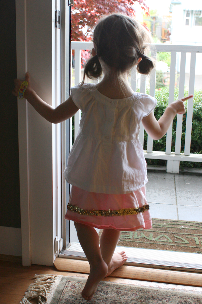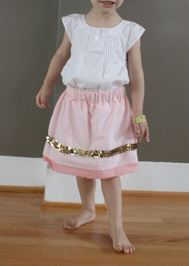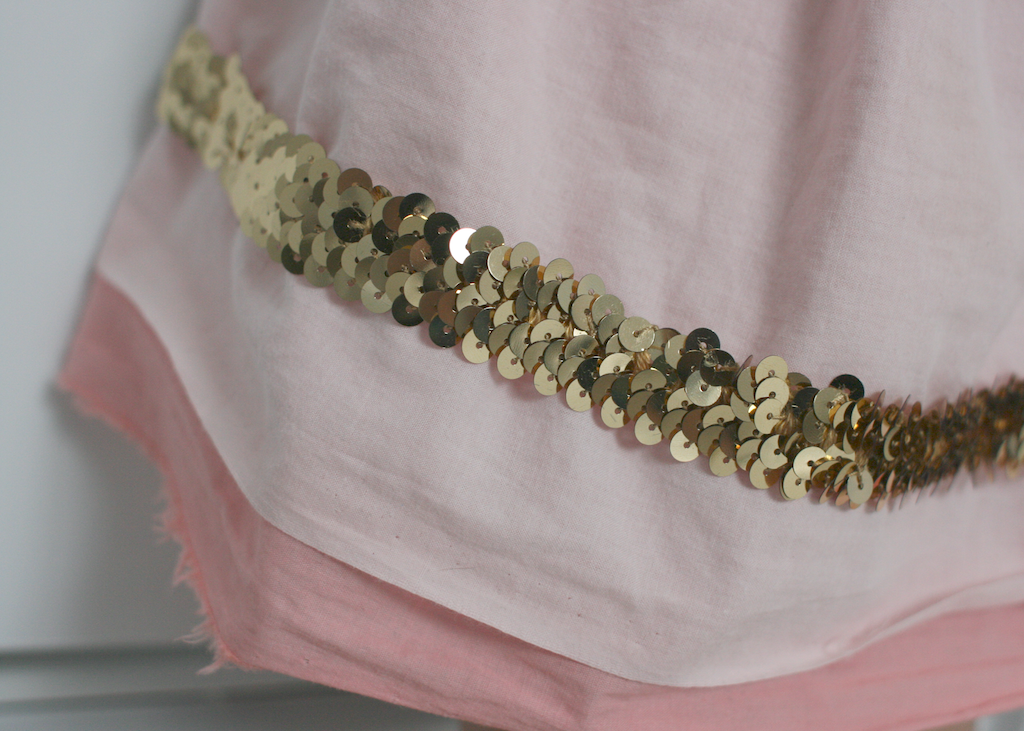 i made her skirt loosely based on this crewcuts version (also discovered on pinterest, seriously my favorite site on the internet). it’s a layer of voile and a layer of batiste with the selvedges as the hems. then i hand-tacked on a row of sequins. she looooooved it.