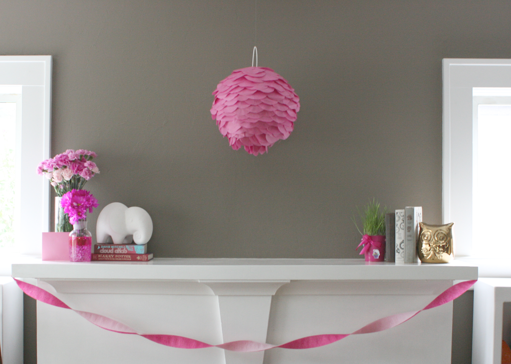 my main “statement piece” was a flower piñata like i’d seen on inchmark last year. it took a long time to cut out and stick on all of the petals (my husband did most of the cutting out), but i love it. i didn’t have the heart to break it. i’m planning to hang it in her room once i’m ready to take it out of the living room, but i do love the pink pop against our walls for the time being.