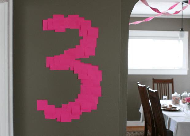 despite my best efforts to dress her in neutral colors as a baby and avoid too much pink, my daughter claimed it as her most favorite as soon as she learned her colors. she wants pretty much everything to be pink. last year for her second birthday, i organized an “up party” since it was her favorite movie at the time (photos here and here and her dress here). this year, i indulged her and just went with the pink. a couple weeks before the party, i started a pinterest board and rounded up a bunch of great party ideas i remembered from around the web. the post-it note big 3 above was a combination of this post-it note wall art and this giant number from oh happy day! i also hung twisty streamers like i saw on aesthetic outburst, only i made them two-tone with lighter and darker pink.
