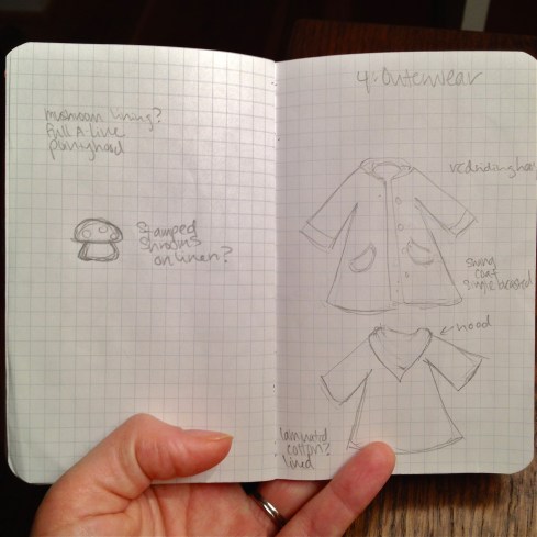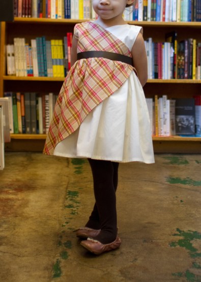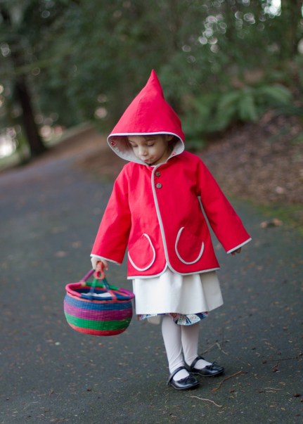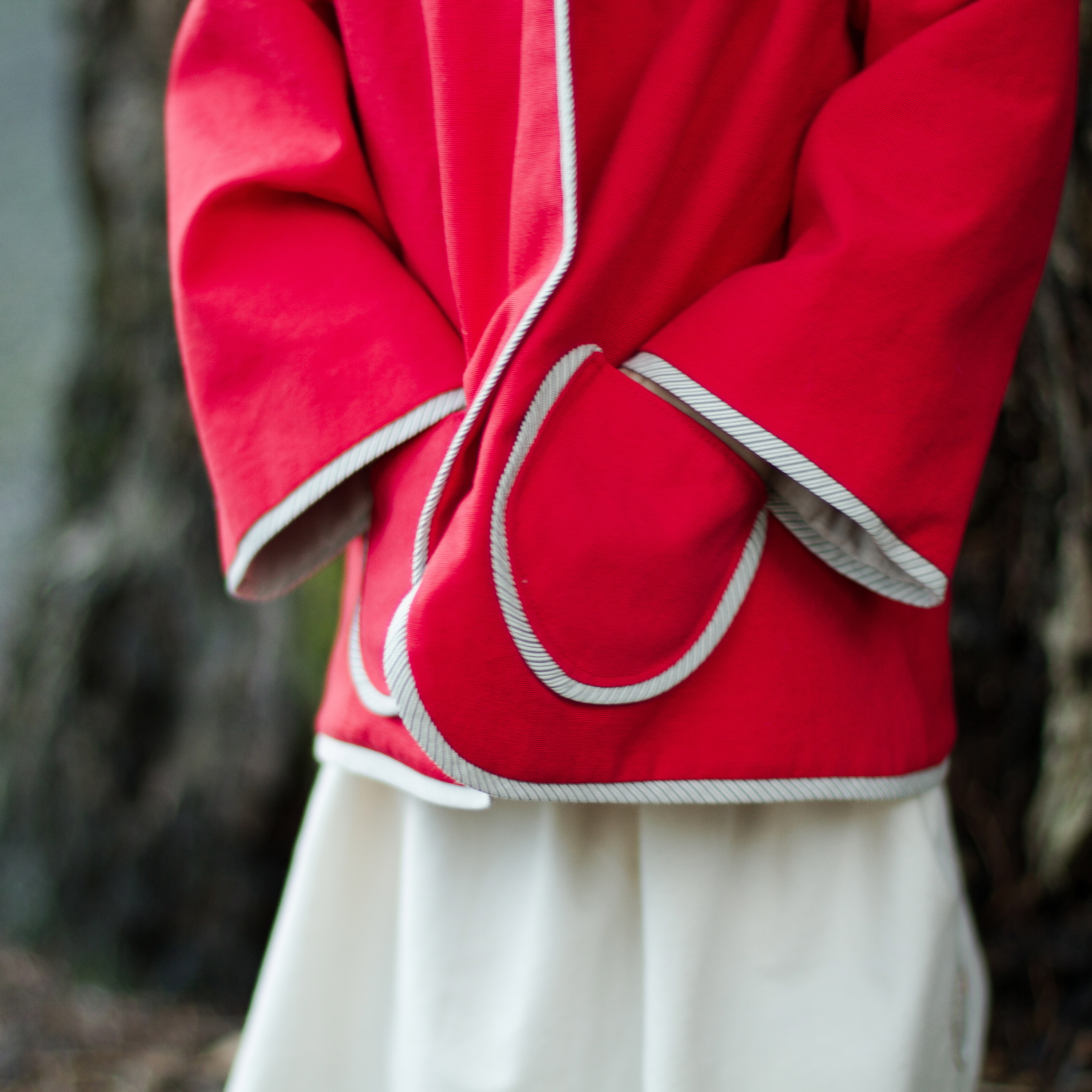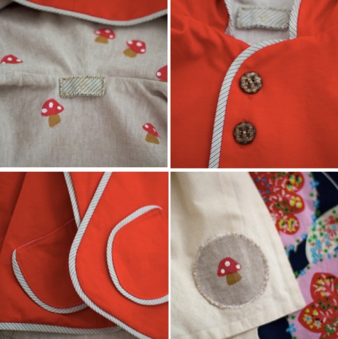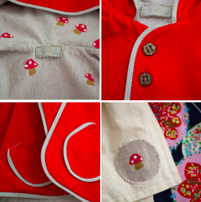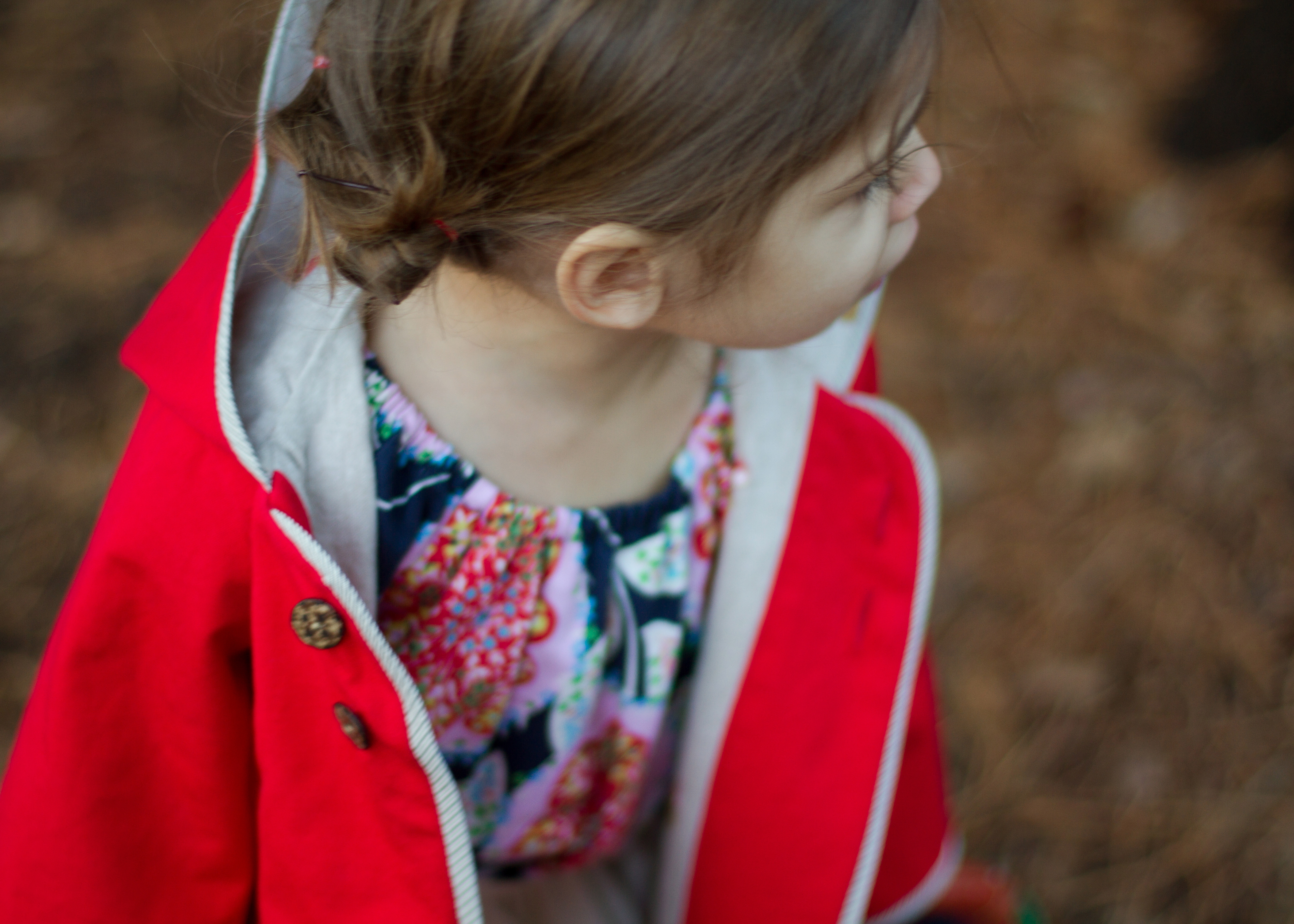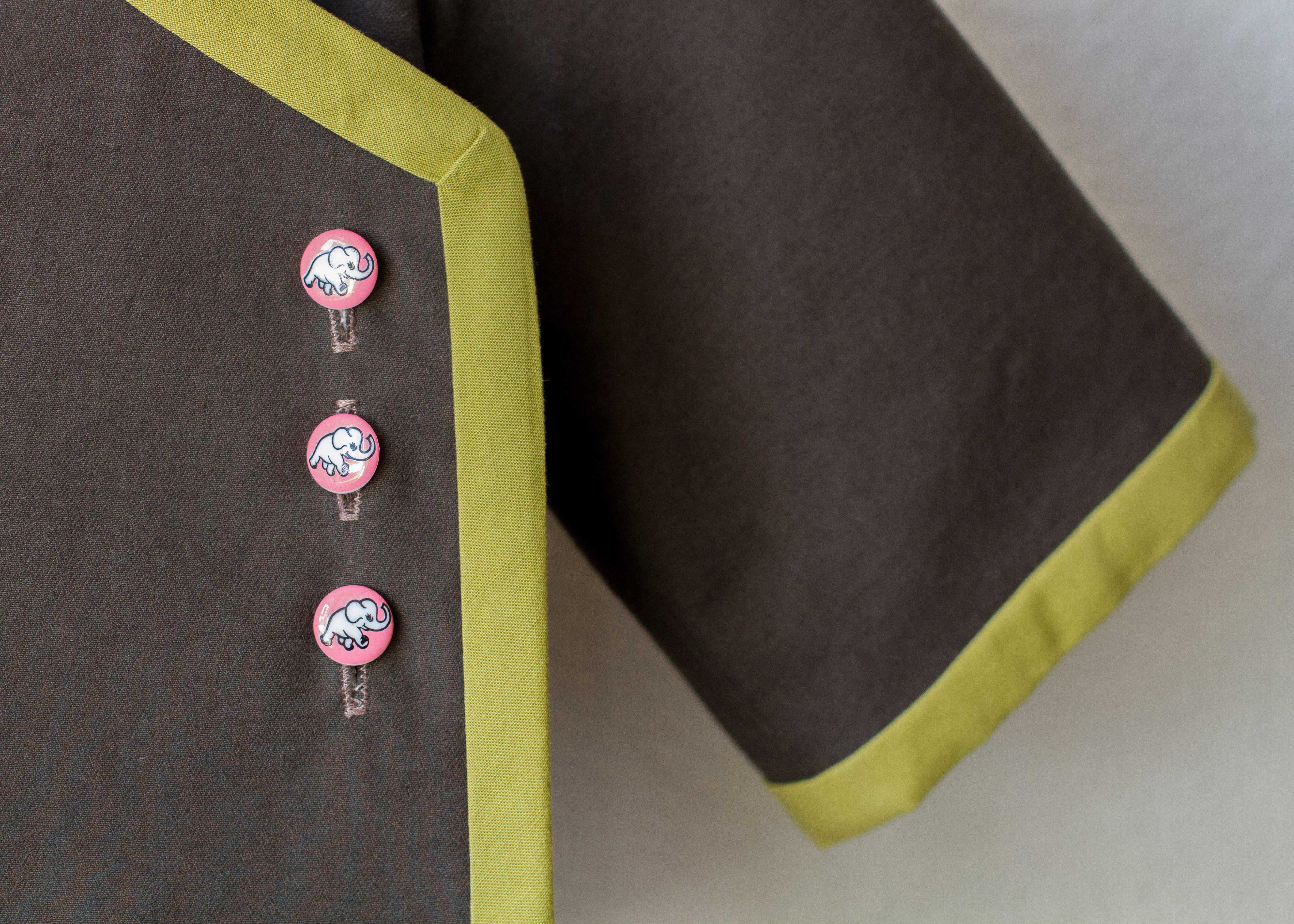 for the jacket pattern, i took the one i made for little red and shortened it, slimmed it a bit, and shortened the sleeves by a couple inches. then i drew a subtle curve from one shoulder to the other armpit, similarly to how i drafted my sweet tartan dress. so the pattern is still originally based on the oliver + s sunday brunch jacket (out of print but can be found in stores, and they’ve been realeasing lots of out of print patterns as digital ones lately), but the only original elements left now are the armholes and shoulder seams! it closes with three of those cute little elephant buttons.