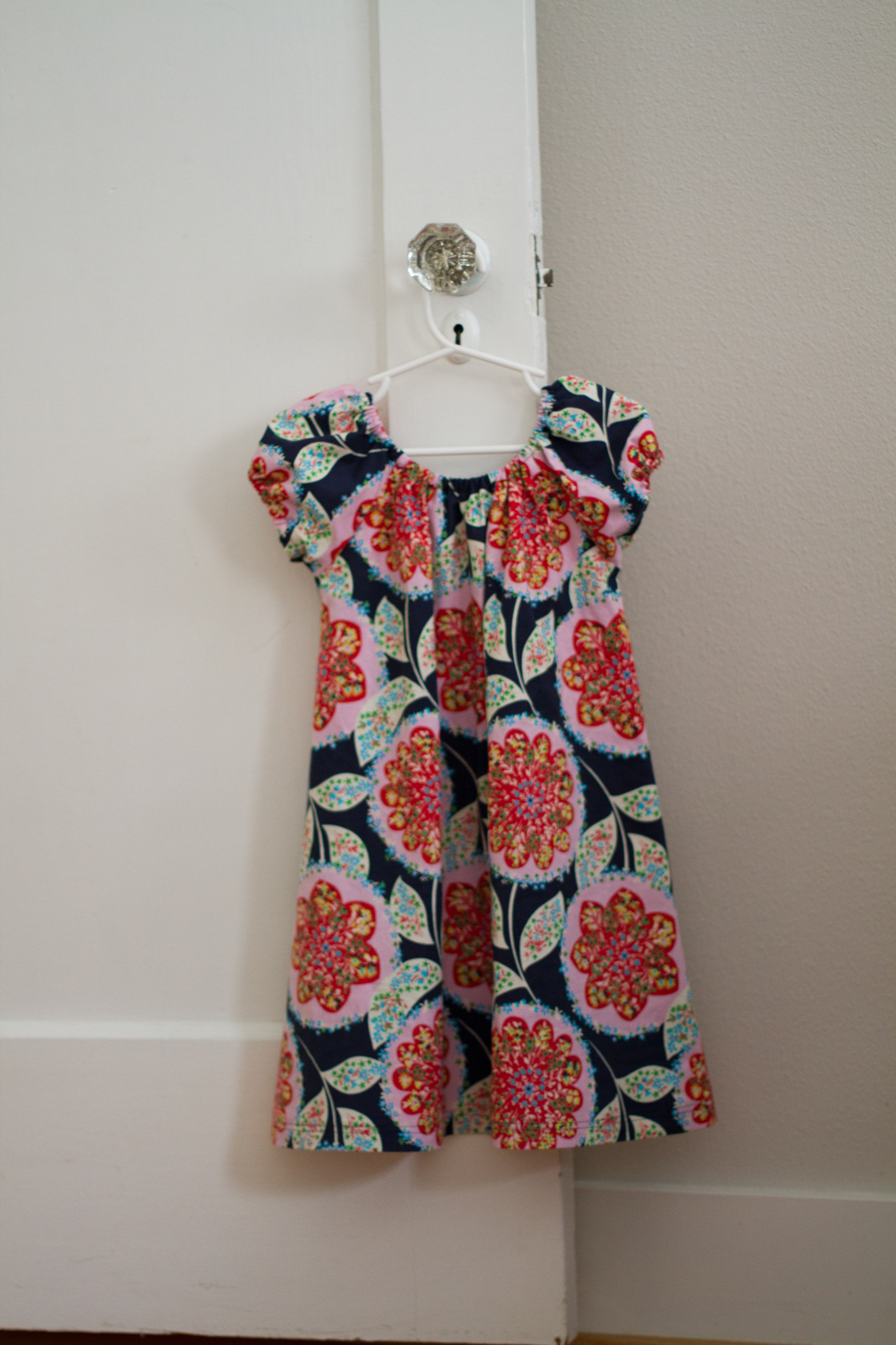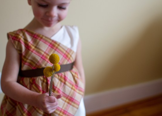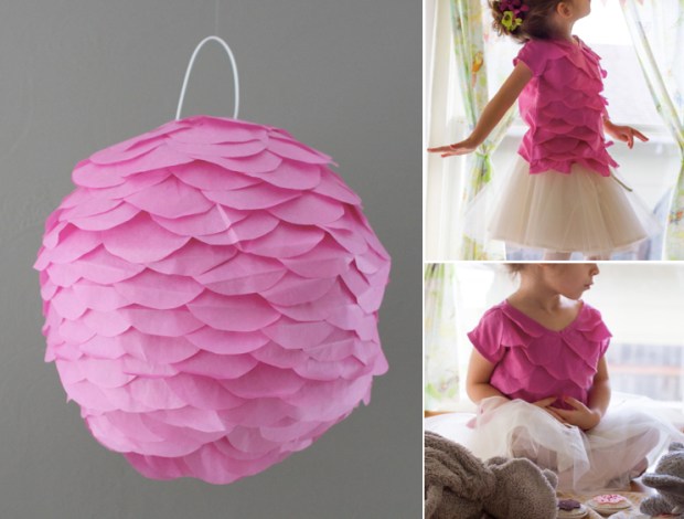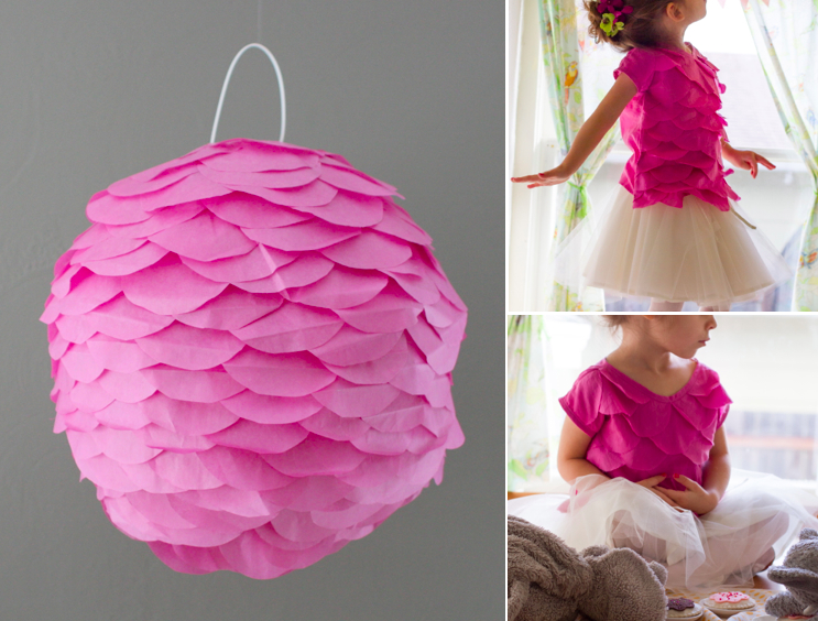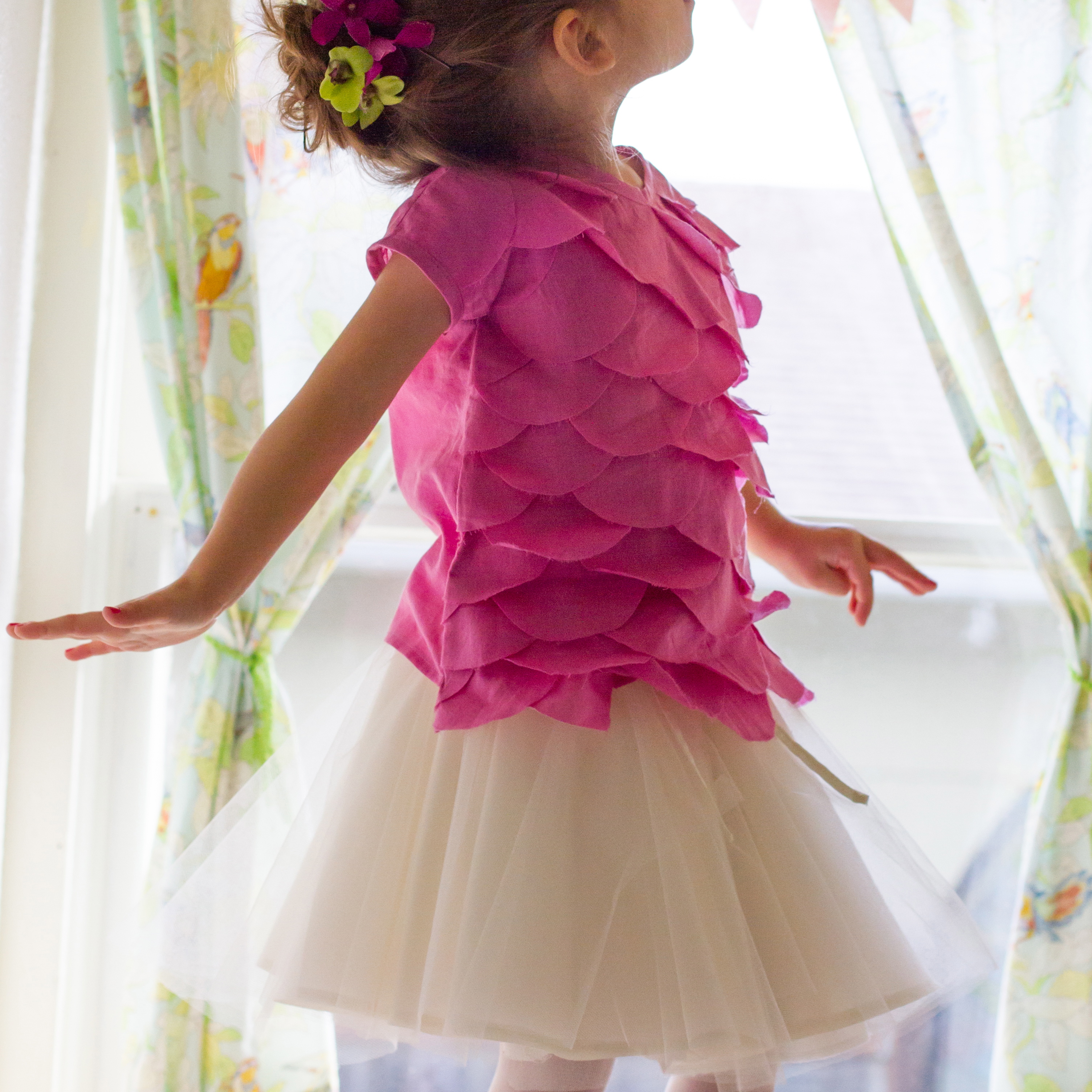 i even used the same petal template! it’s all pink voile (the birthday pinata is tissue paper). i hand cut the 65 petals and decided to leave all edges raw for a fluttery look. i lined them up in a row, stitched them down, layered the next ones on top, stitched those down, etc. i then sewed the front and back parts of the shirt together, bound the neckline and armholes, and hemmed the bottom. pretty easy, but a really nice textural effect and added the dose of pink that Em loves.