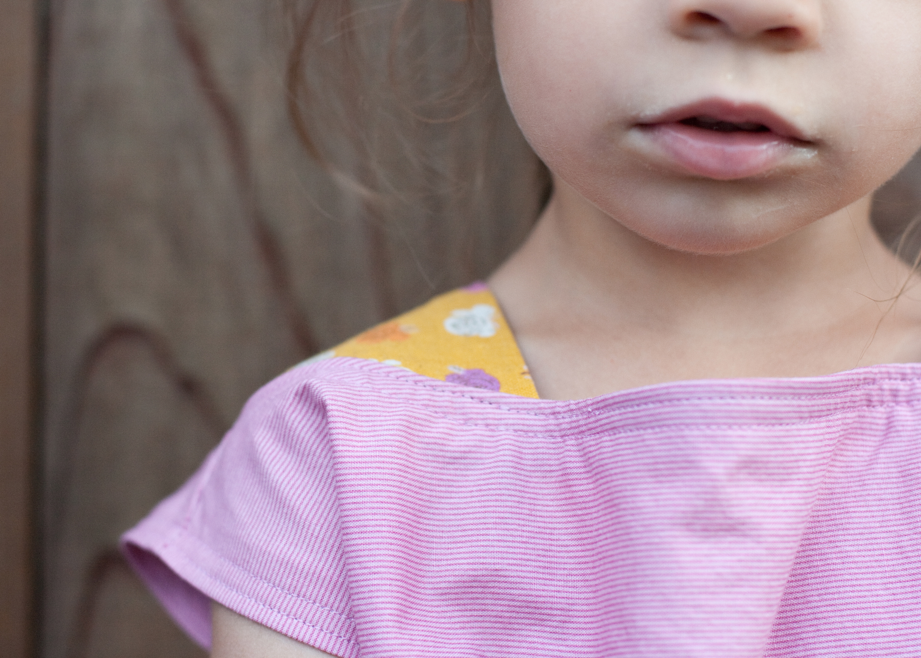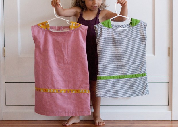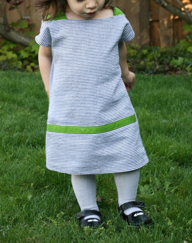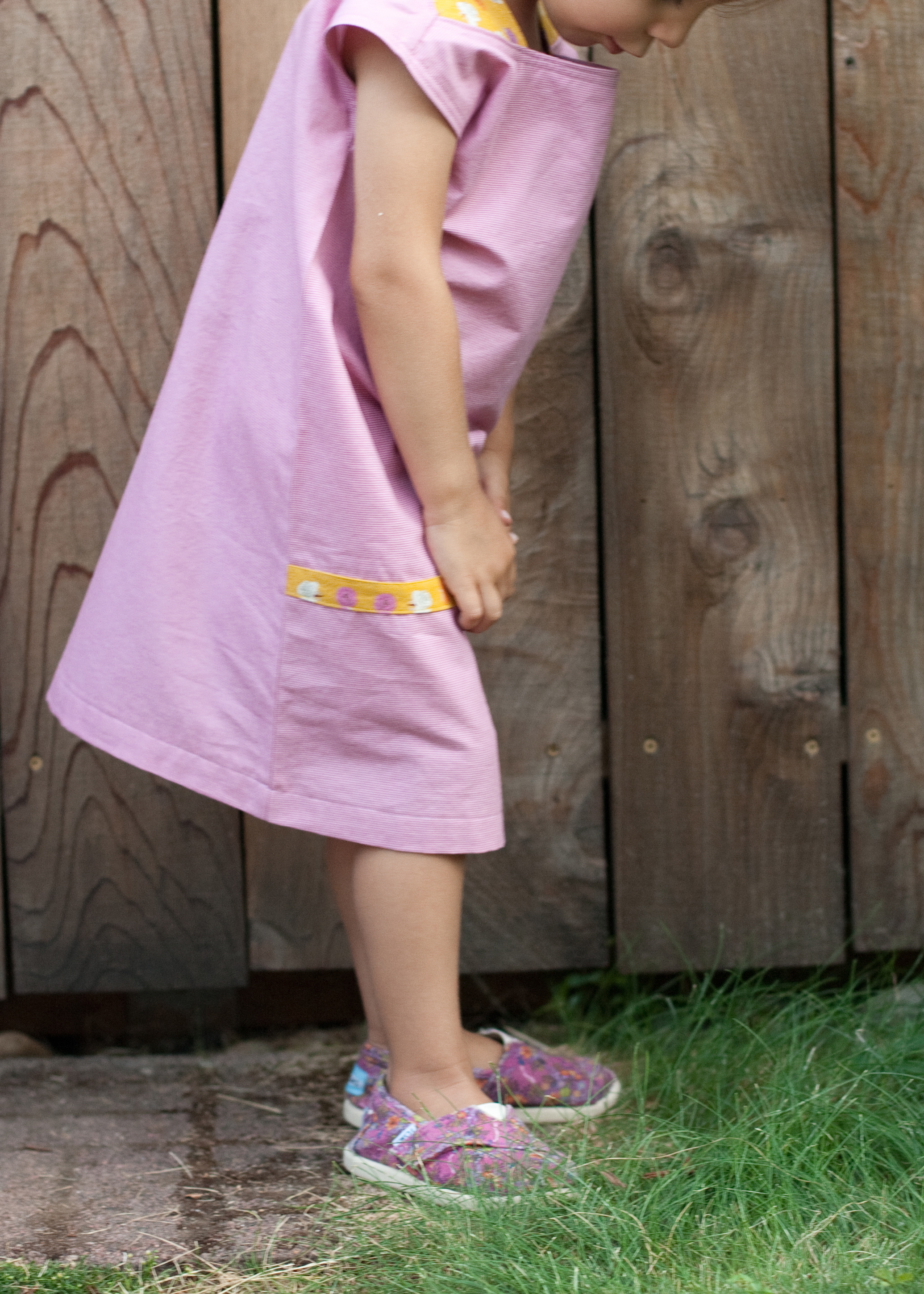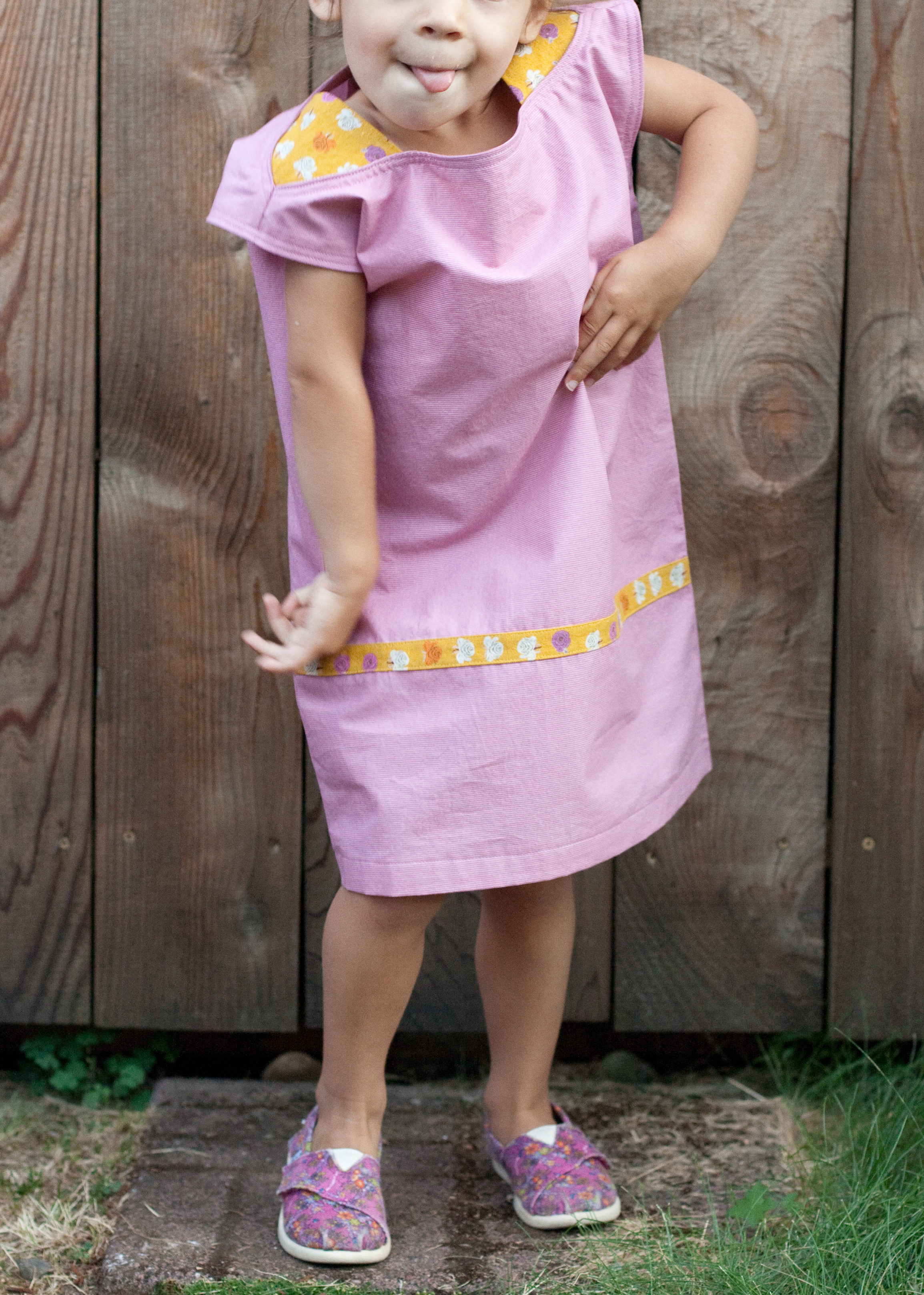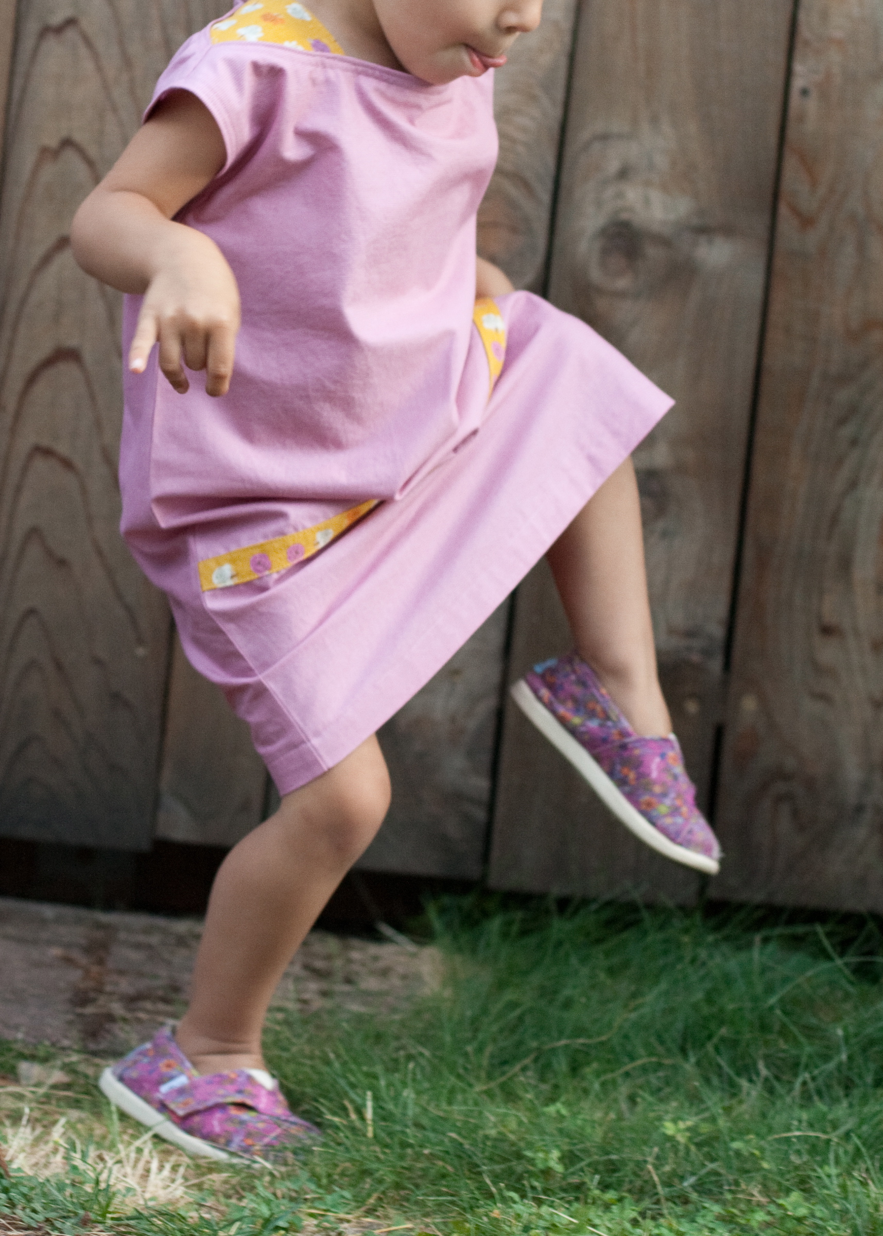 i sewed a size 4, which fits her now! last time i sewed from this book, i sized it down a bit and it was still too big. but now it’s perfect, which makes me want to sew even more of these. because if i ask her to jump and she does THIS, it makes me want to sew a million: