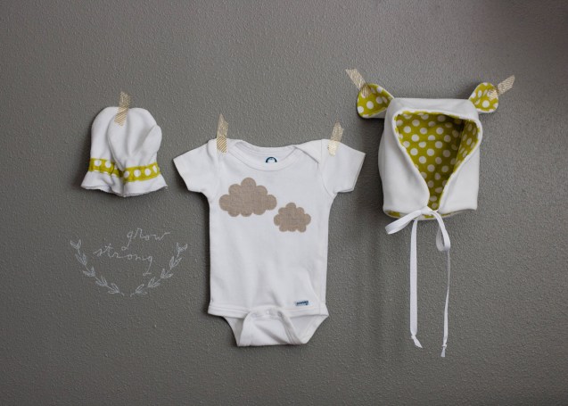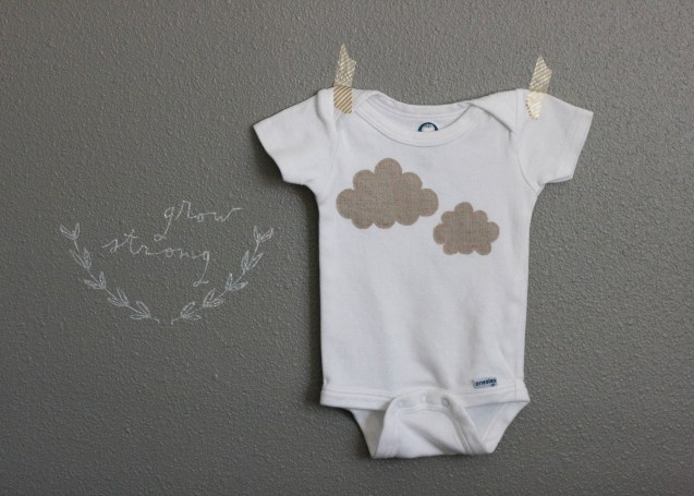 i couldn’t help myself and also appliquéd a 0-3 month onesie with little clouds. i love the white-and- natural linen together. these photos were taken in O’s room (which i need to finish up and do a room tour for). isn’t the wall decal perfect for a baby’s room? it’s by shanna murray. i’m in love with it, and my little guy is definitely growing strong so far!