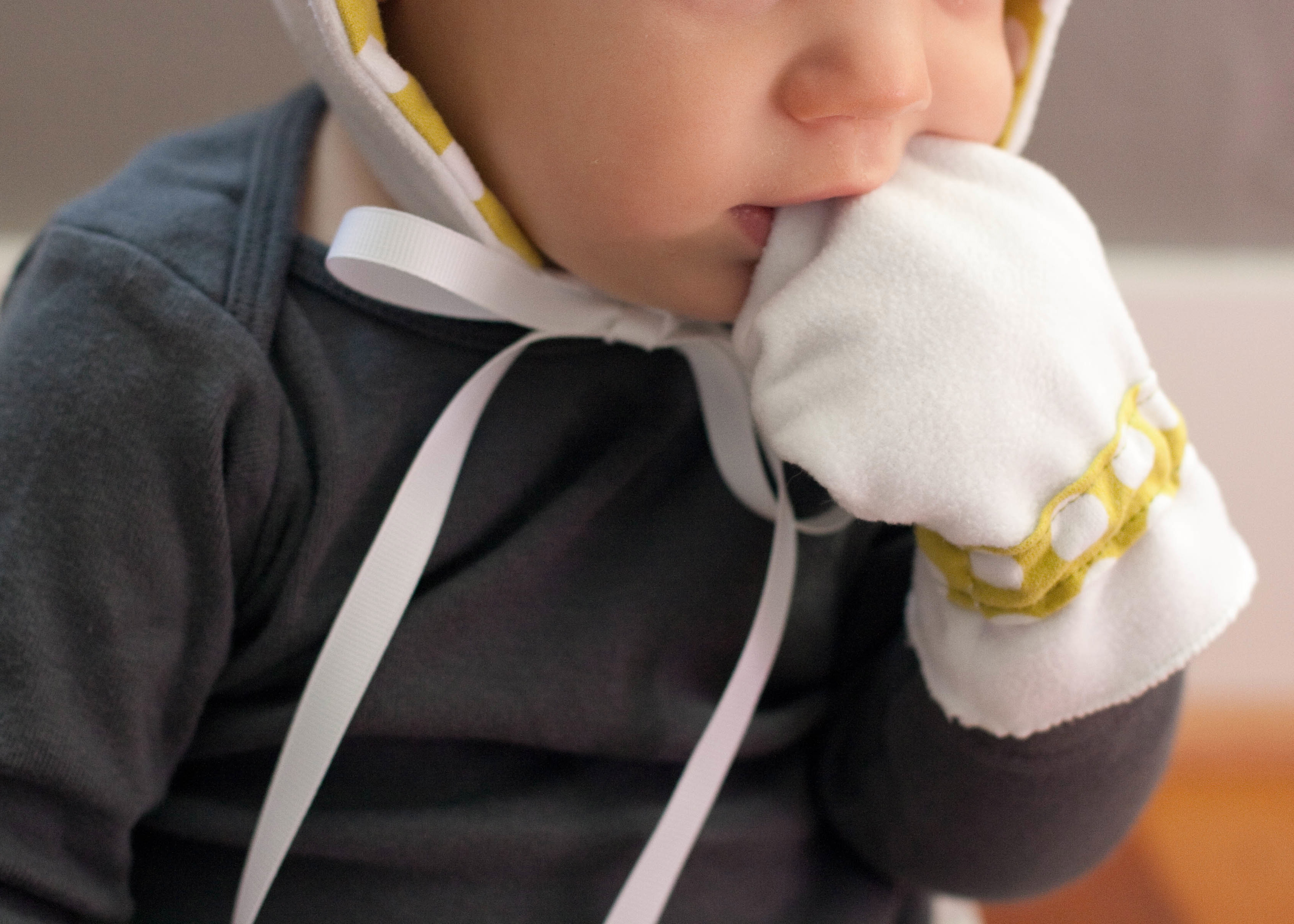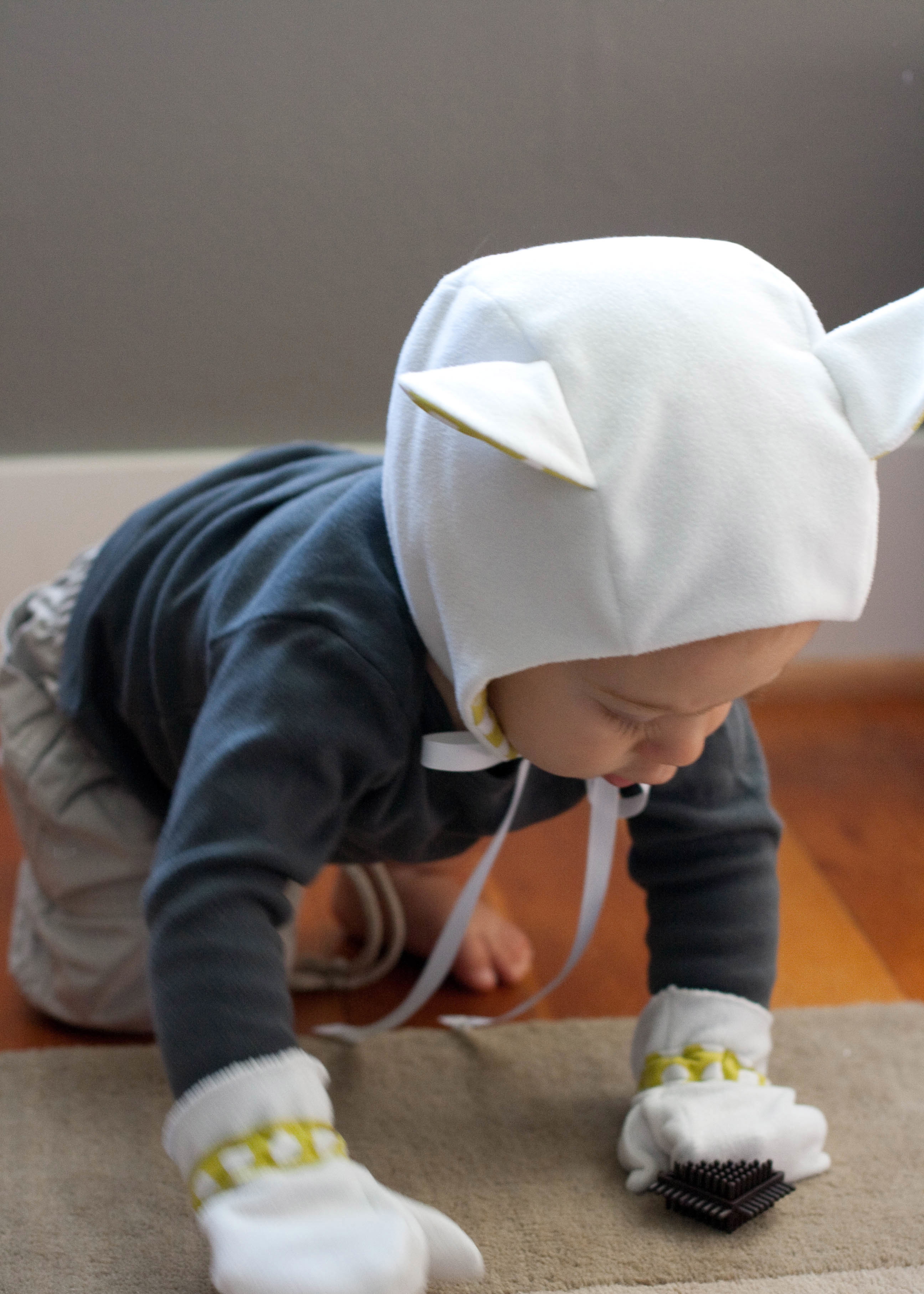 i decided to make another two projects from my now well-used and dog-eared copy of “little things to sew” by liesl gibson – the cozy winter hood (with ears!) and mittens. i made them in an extra-small, but they fit O perfectly at 9.5 months, so i think therese & chris’ baby might get more use out of them next winter instead of this one. both the hat and mittens are made in a supersoft white microfleece and michael miller celery ta dot flannel.